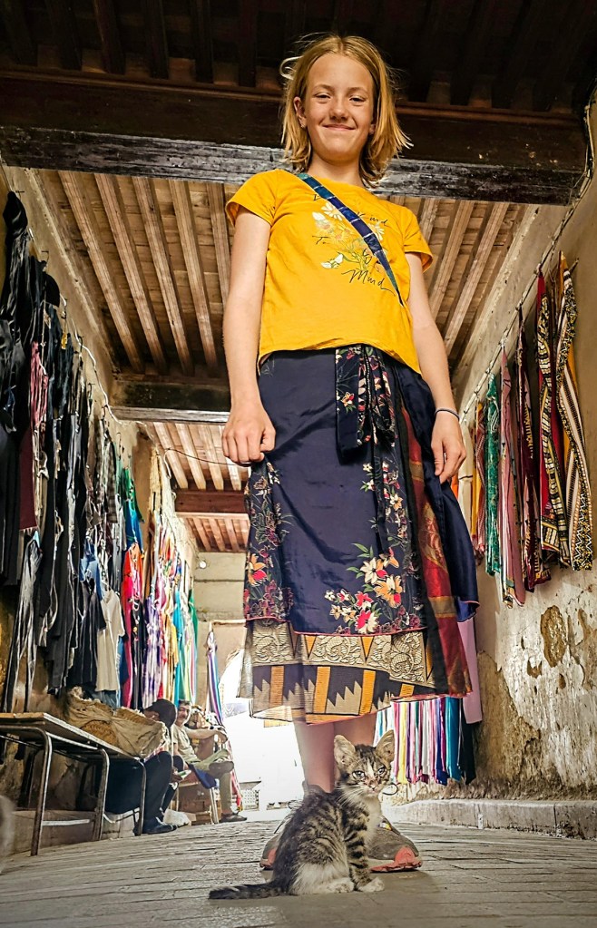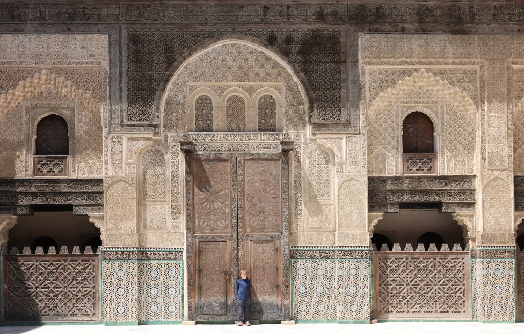 The souk within the medina of Fes was delightfully chaotic. It was fun to see the kiddos navigate the narrow alleyways and market stalls, sharing the same space with locals, thousands of stray cats, and at least a couple of heavily-laden donkeys carrying dozens of propane tanks that I liked to think of as “turbo-donkeys”. We also observed two men driving motorcycles at significant speed while carrying full-grown sheep on their laps, which seemed to me to be perhaps not a well-thought out scheme.