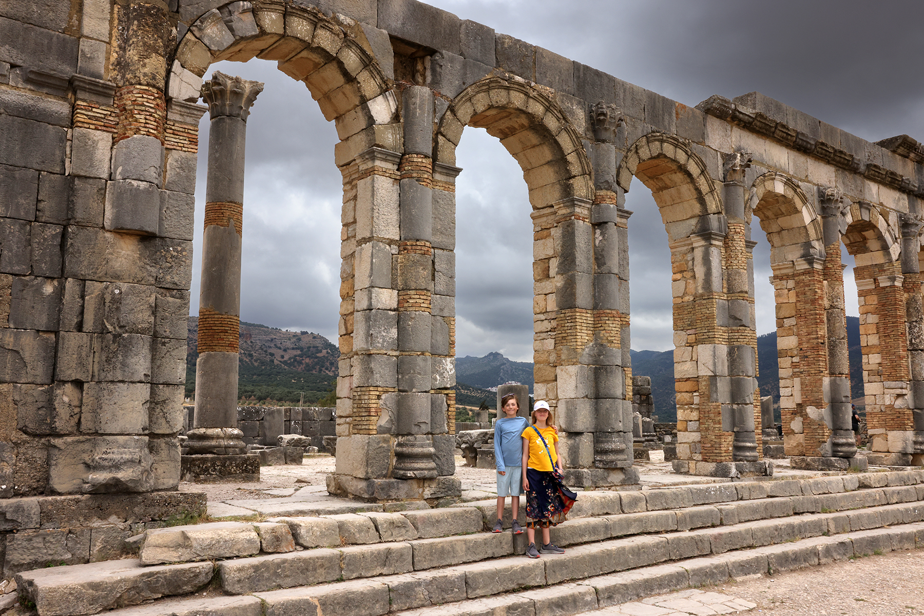 The reconstructed portions of Volubilis were especially beautiful. We enjoyed the contrast between original Roman grey stones and the red hues of the small stones and bricks used for reconstruction. The kiddos found amusement in imagining they lived in the city – pretending they were running important daily Roman errands (when I asked for specifics I was told this included things like going to the bakery and spending the day lounging in Roman baths).