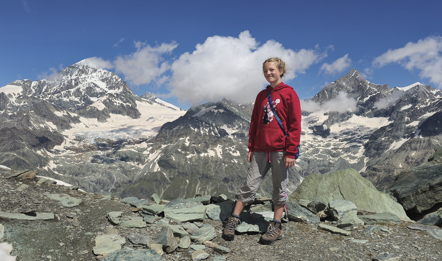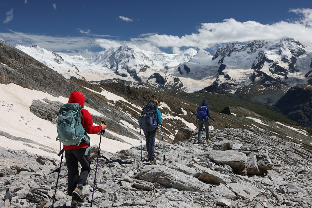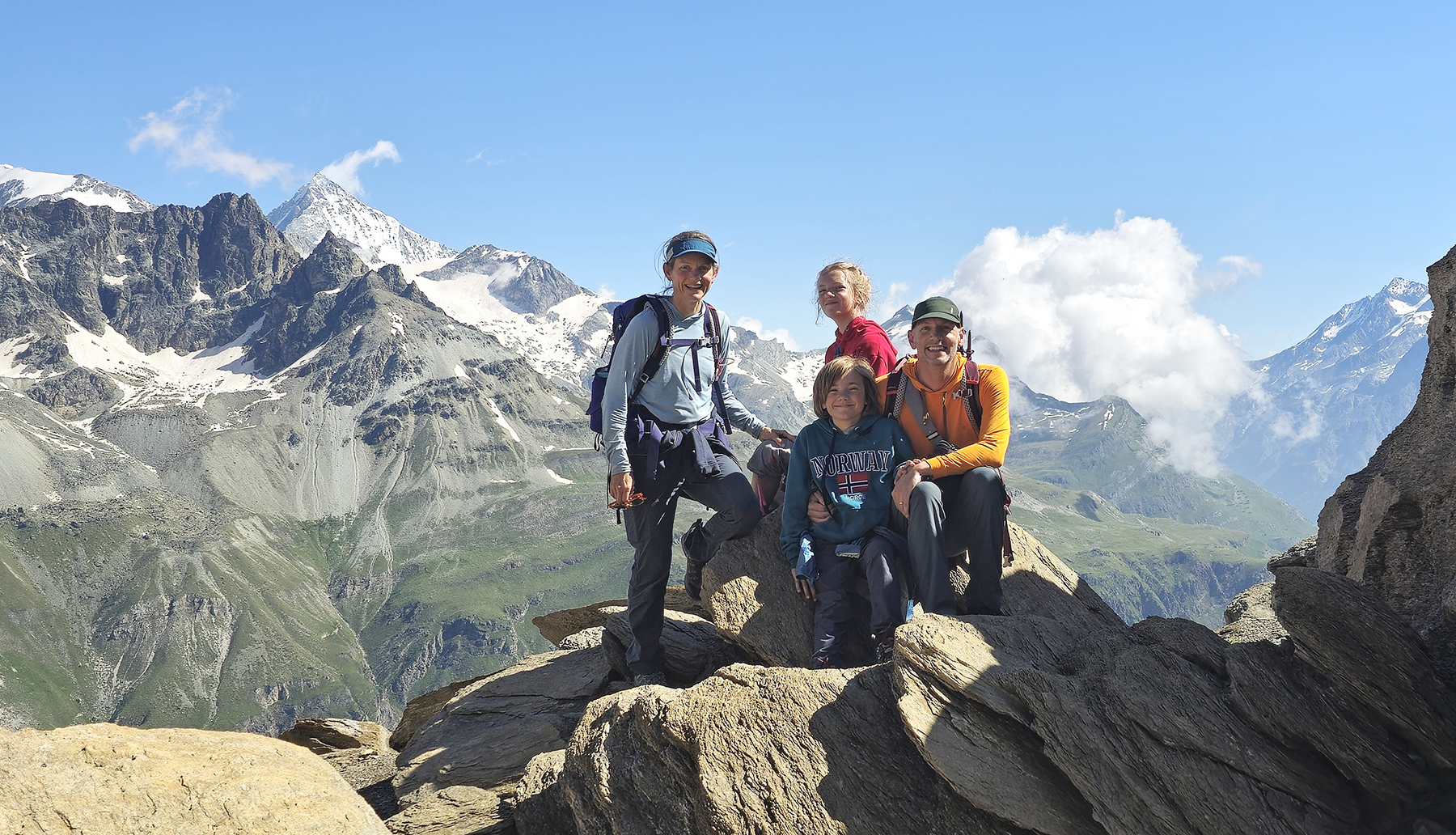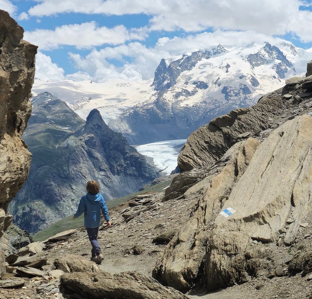 Our family all agrees the most challenging (and rewarding!) alpine route was our journey to the summit of the Mettelhorn. We took 3 days to complete our 37km circuit – beginning from the valley floor in Zermatt, spending 2 nights up high in the mountain hut at Trift, and returning via the scenic Höhbalmen traverse. The kids thoroughly enjoyed their first experience using crampons and a rope for our glacier traverse just below the Mettlehorn summit!