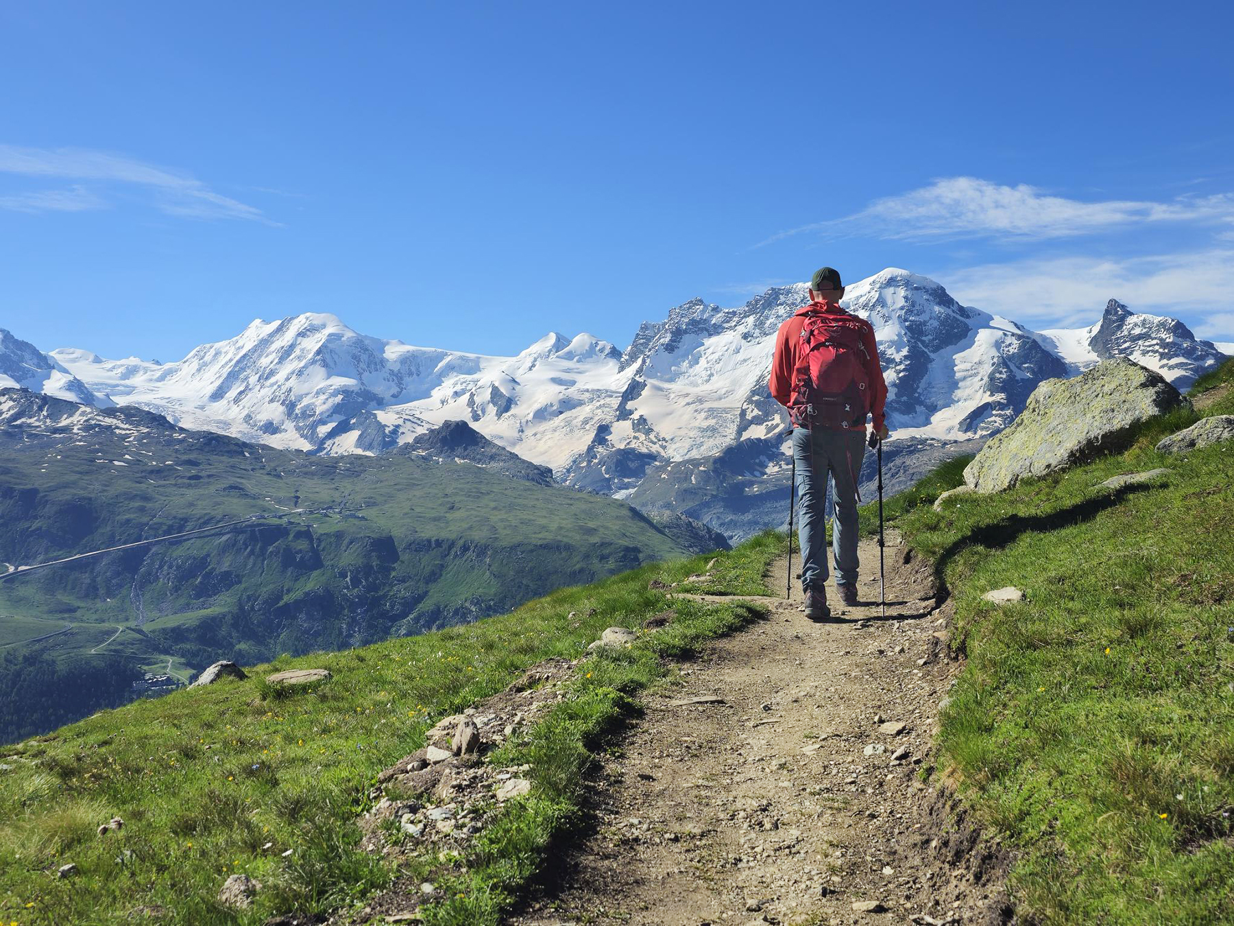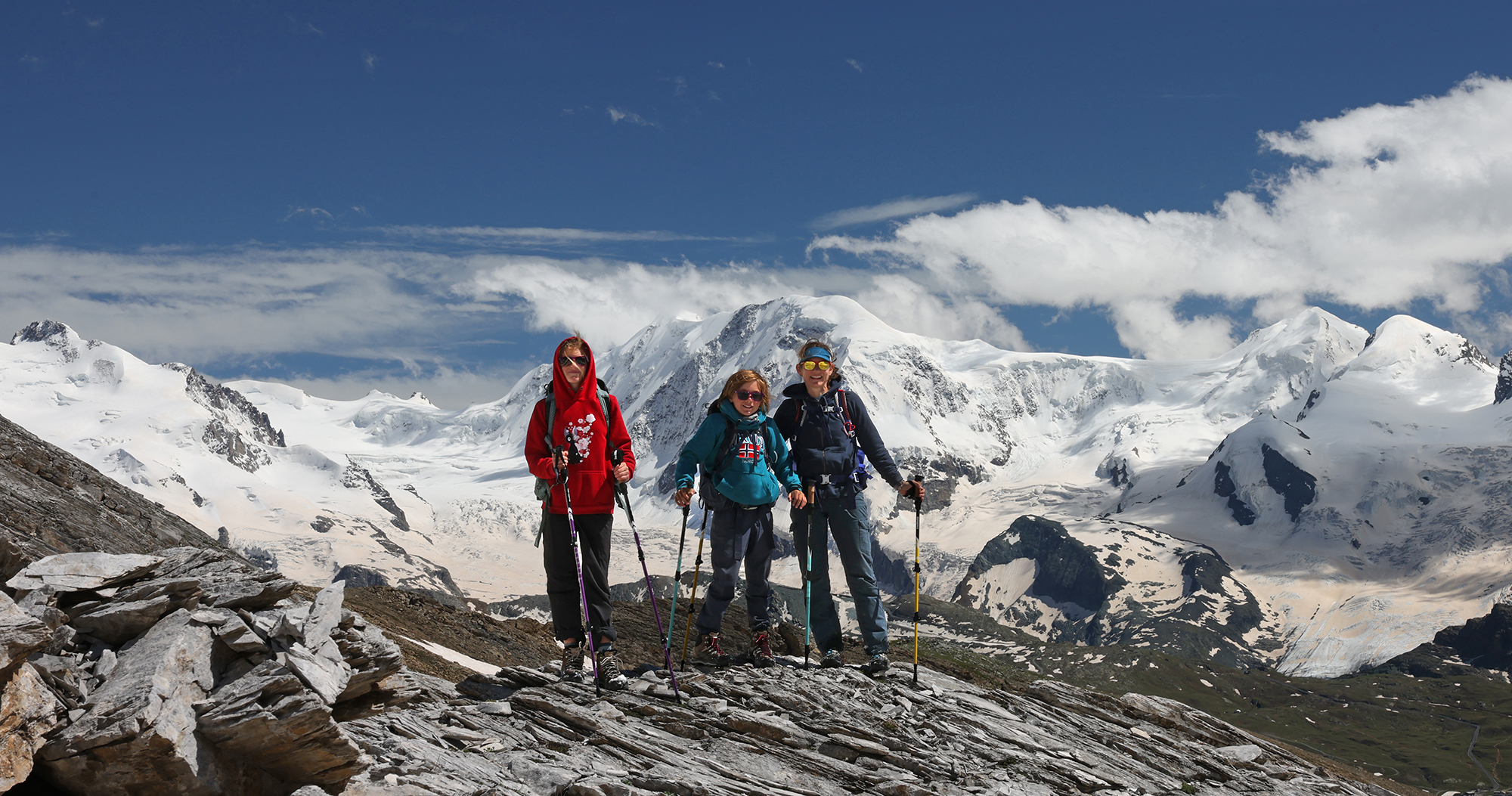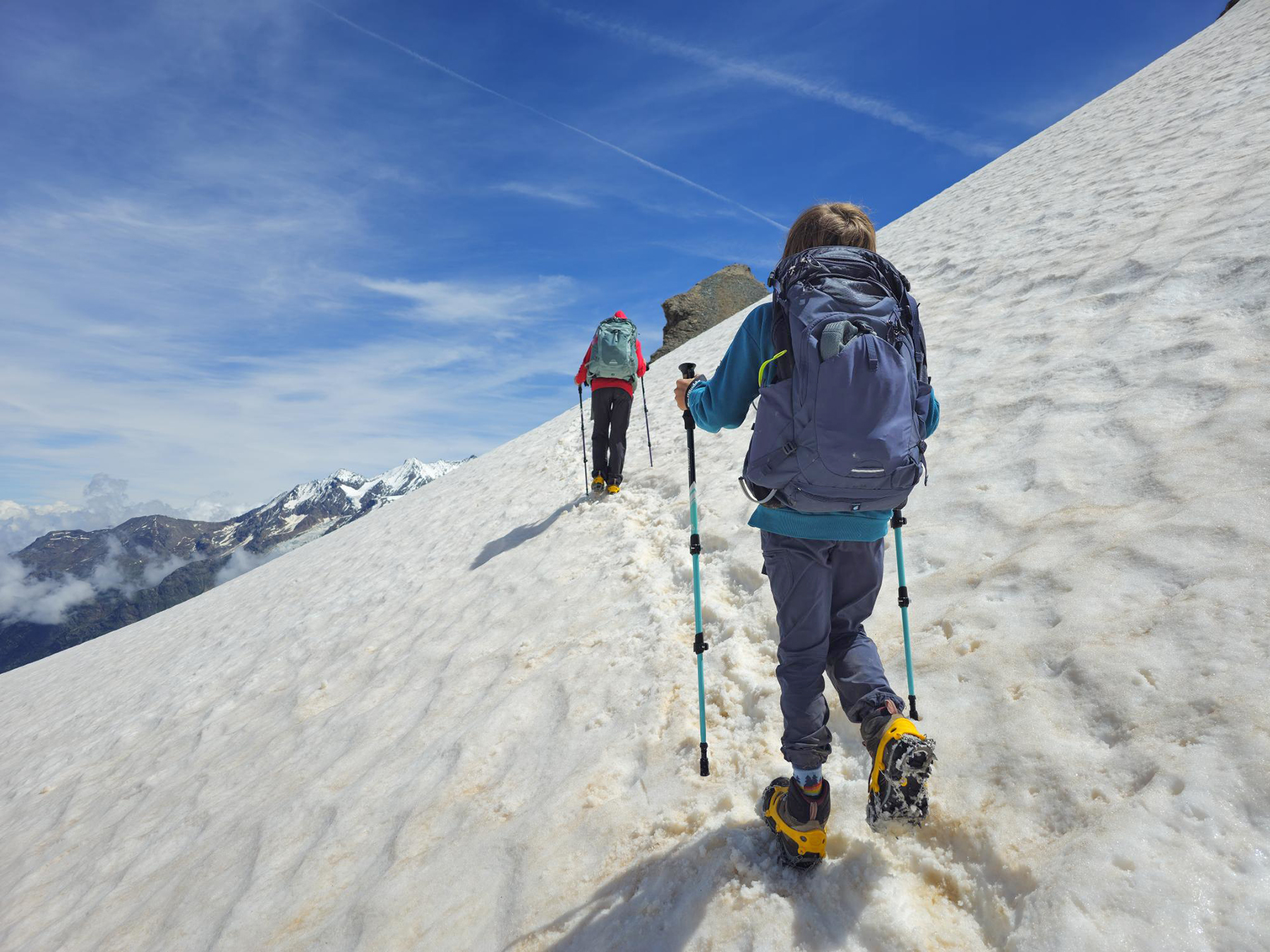 Our family all agrees the most challenging (and rewarding!) alpine route was our journey to the summit of the Mettelhorn. We took 3 days to complete our 37km circuit – beginning from the valley floor in Zermatt, spending 2 nights up high in the mountain hut at Trift, and returning via the scenic Höhbalmen traverse. The kids thoroughly enjoyed their first experience using crampons and a rope for our glacier traverse just below the Mettlehorn summit!