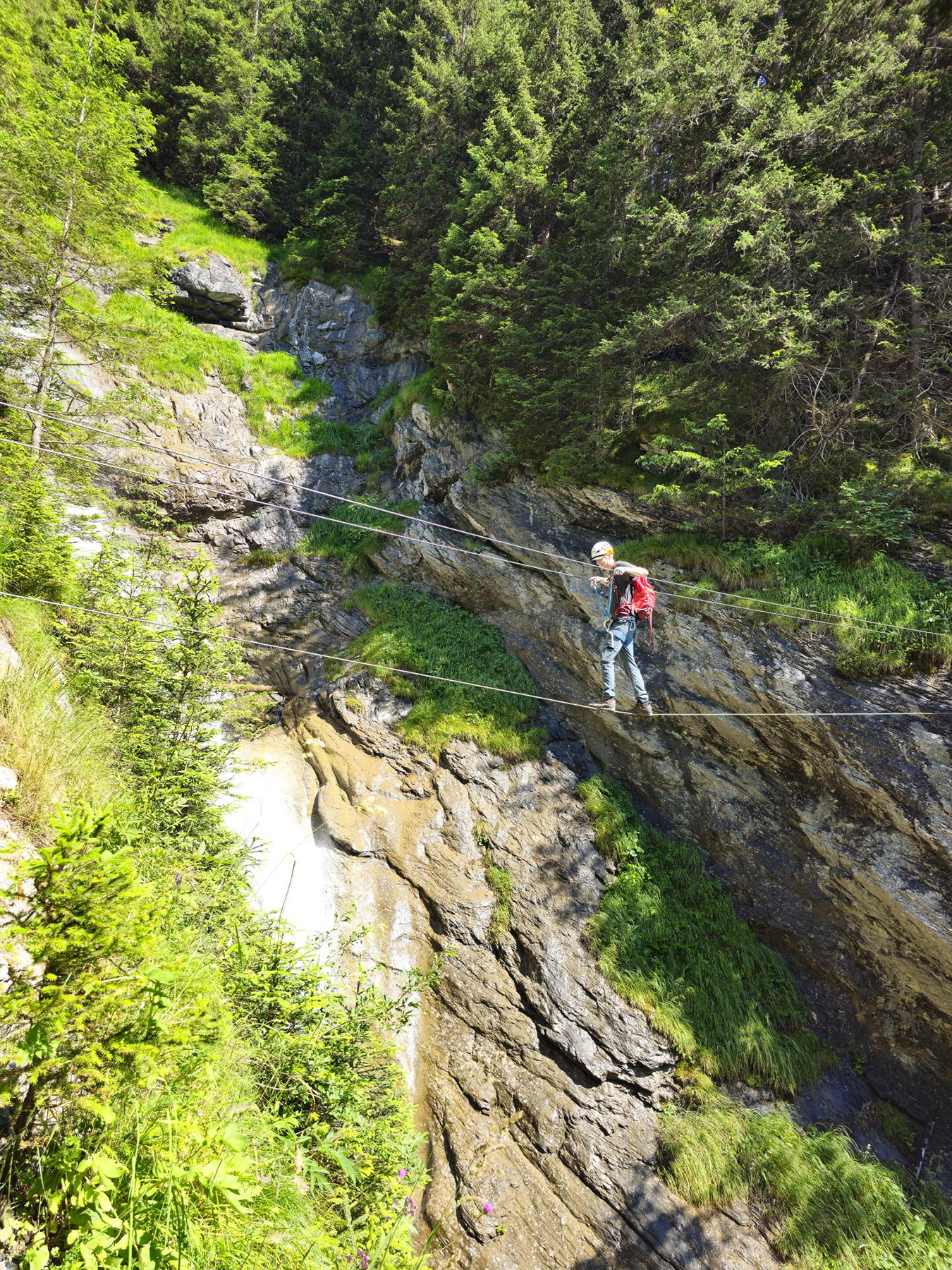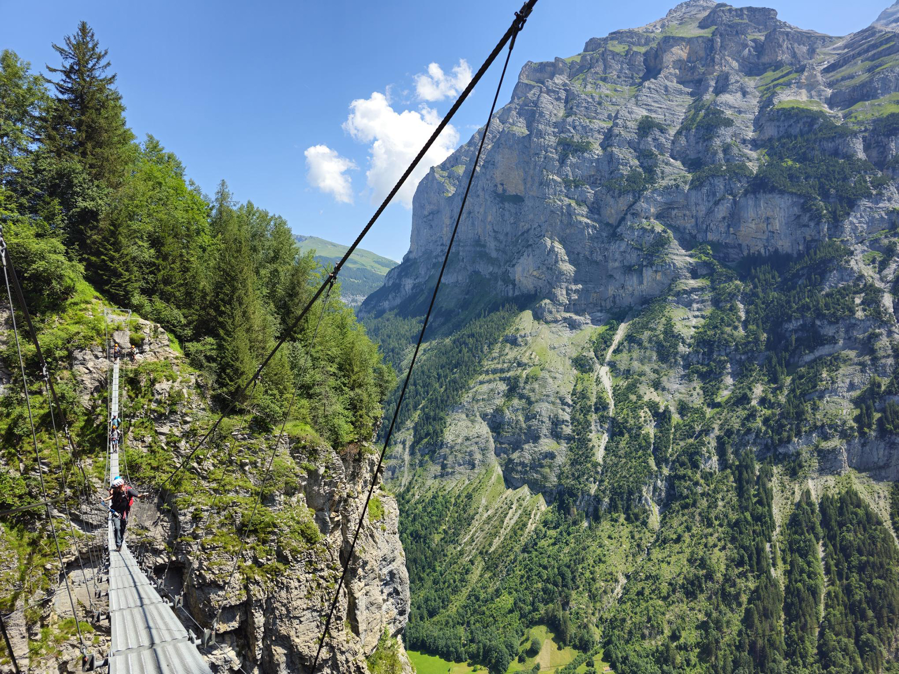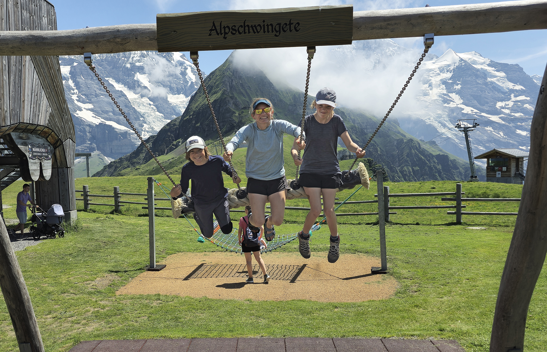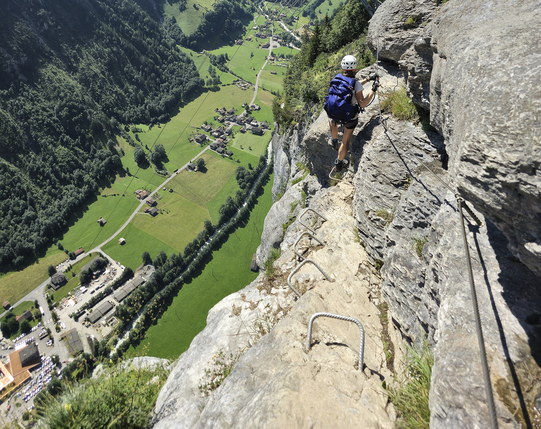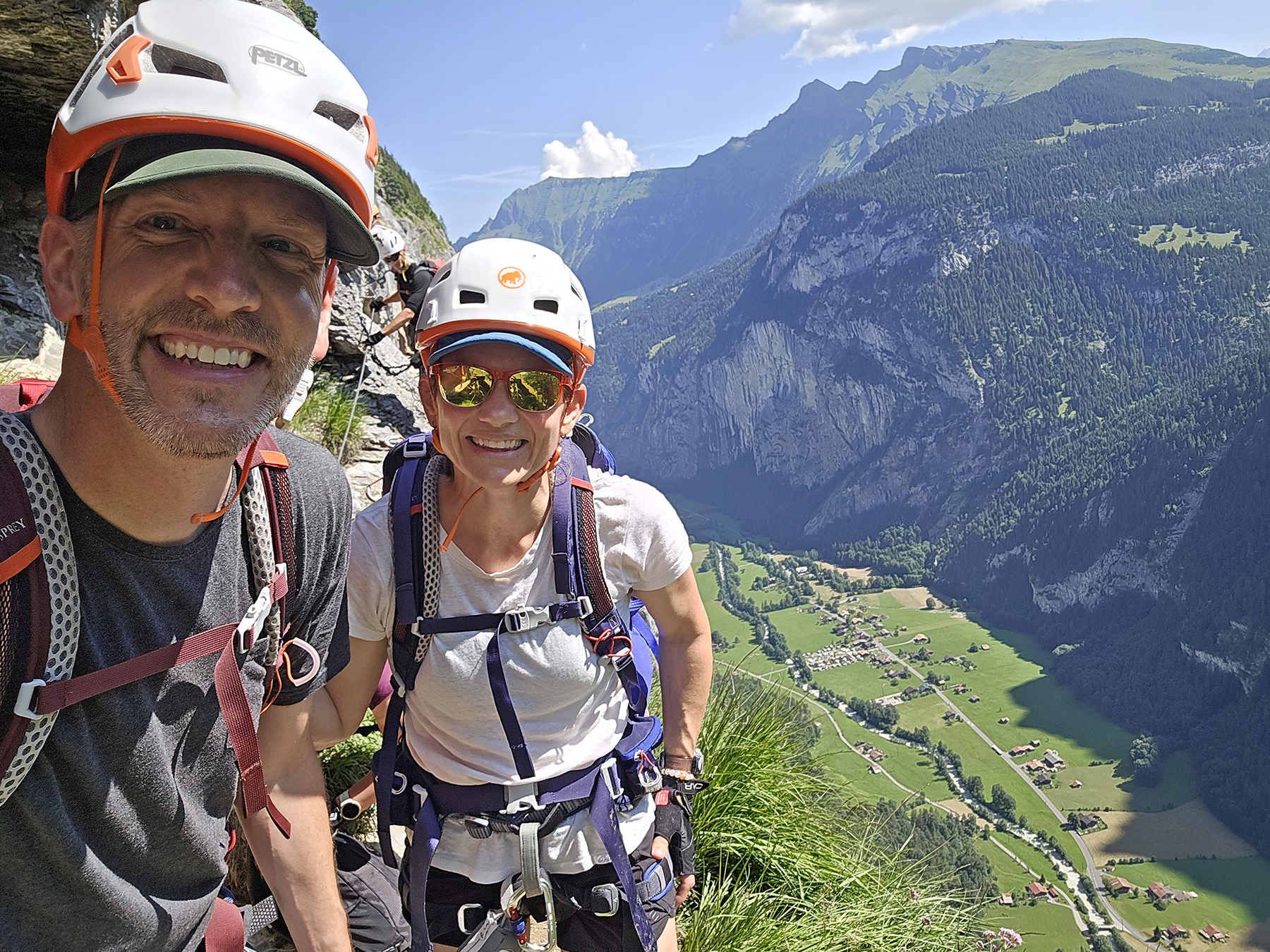 We spent 4 days in the area, using our family travel pass to ride all the gondolas, trains, cable cars, furniculars, and busses… flip-flopping for shorter distances on well-groomed mountain paths. Howie and I were able to sneak away one morning and do a via ferrata route, high on valley wall between the mountain villages of Murren and Gimmelwald. Yay!