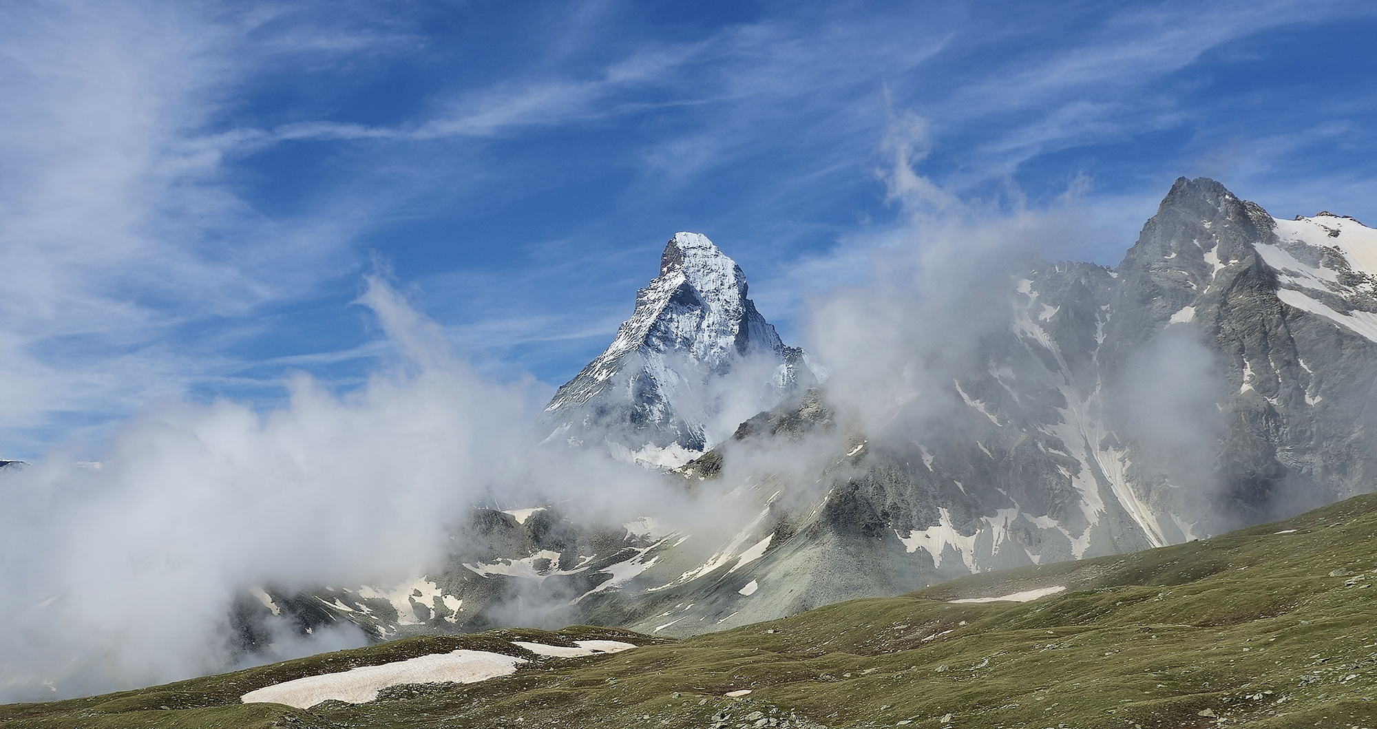 Our travel day from Paris to Zermatt included 1 subway ride, 6 separate train transfers, and a bus (portions of the journey re-routed due to recent flooding and landslides in Switzerland). It set our new record for most consecutive transfers, and was definitely a challenge with all of our gear. The crazy travel day was worth it though, because when we arrived in Zermatt it immediately felt like coming “home.” This small mountain village is where Howie and I got engaged, exactly 20 years ago. Our 2005 wedding in Colorado included a wedding cake shaped like the Matterhorn, my bouquet filled with mountain daisies, fondue for our guests, and our 1st dance was a waltz to “Eidelweiss” – all nods to this very special place.