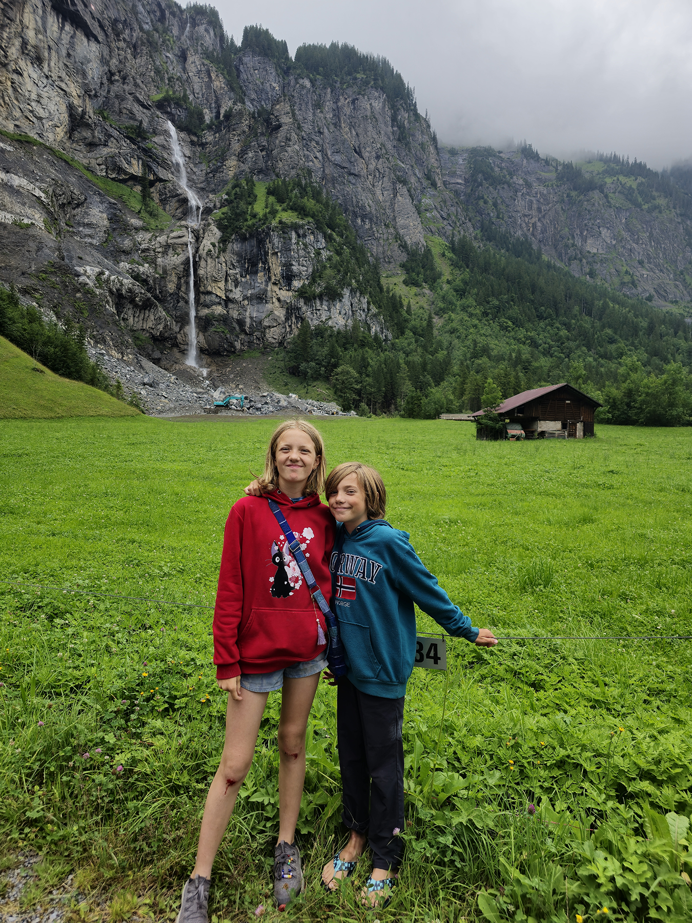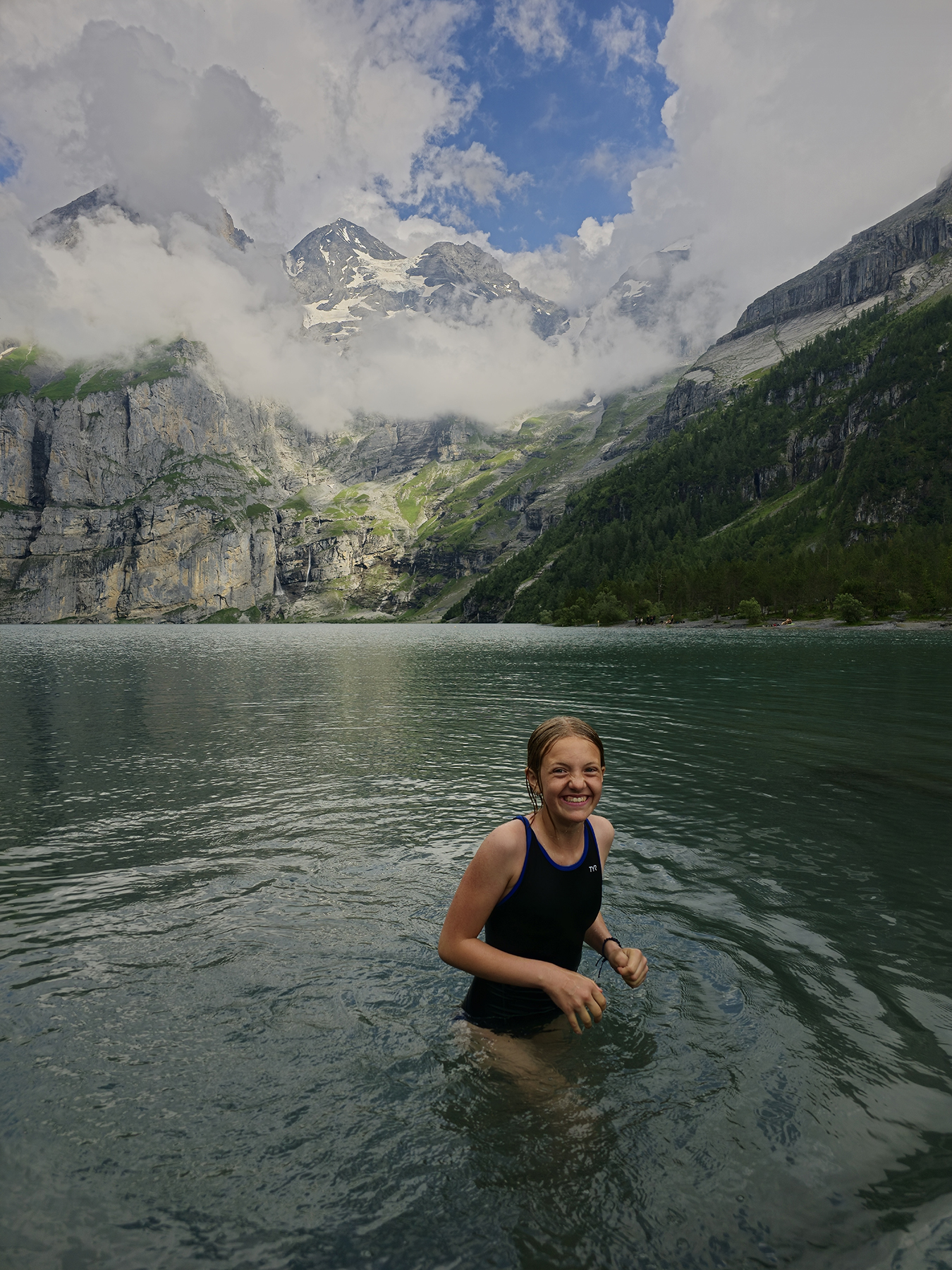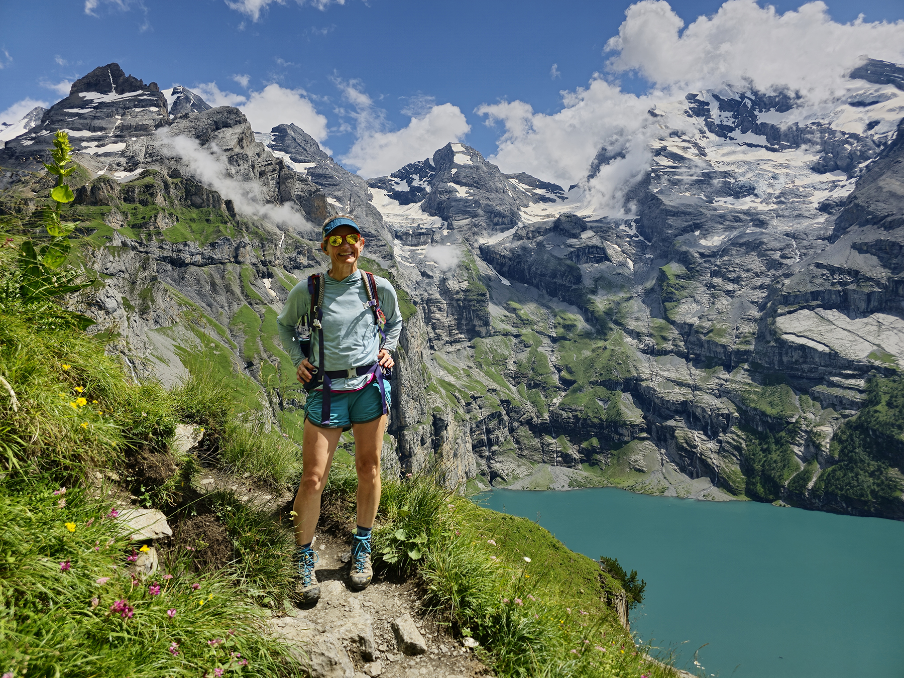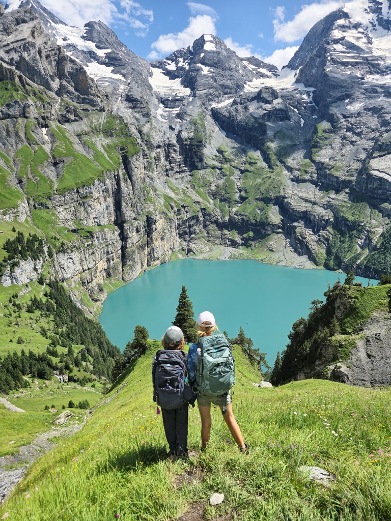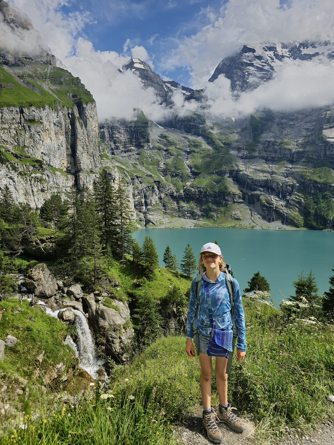 By the end of our time in Kandersteg, H’s ankle and foot had healed to the point where hiking boots could be worn once again. Yay!!! We were able to spend a day hiking on the mountainside above Oeschinen Lake. We discovered abundant waterfalls along the way which we hiked over, beside, and through… all cascading into the glacial lake below.