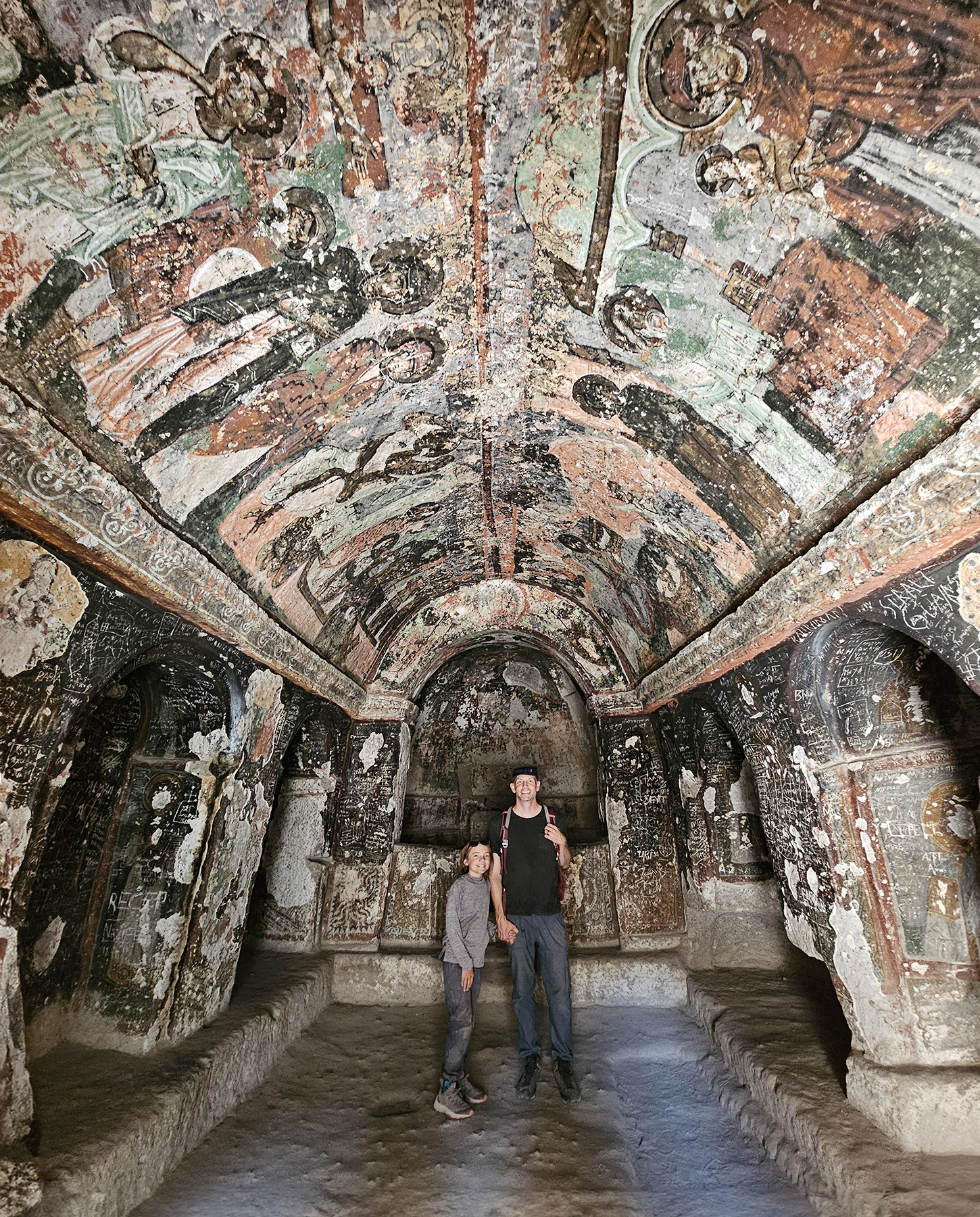 In addition to ancient underground cities, Cappadocia is also famous for its distinctive “fairy chimney” rocks (hoodoo formations) which have also been inhabited for thousands of years. Interestingly, these amazing rock formations were also home to some of the earliest churches in Christianity. In fact, the region of Cappadocia was vital for the establishment and spread of very early Christianity. As we hiked through the valleys surrounding Göreme, we would stumble upon these ancient early Christian churches, carved into the rock – frescos from nearly 1,600 years ago still visible on the walls and ceilings (sadly, all of this history is not-so-well protected from damage/vandalism).