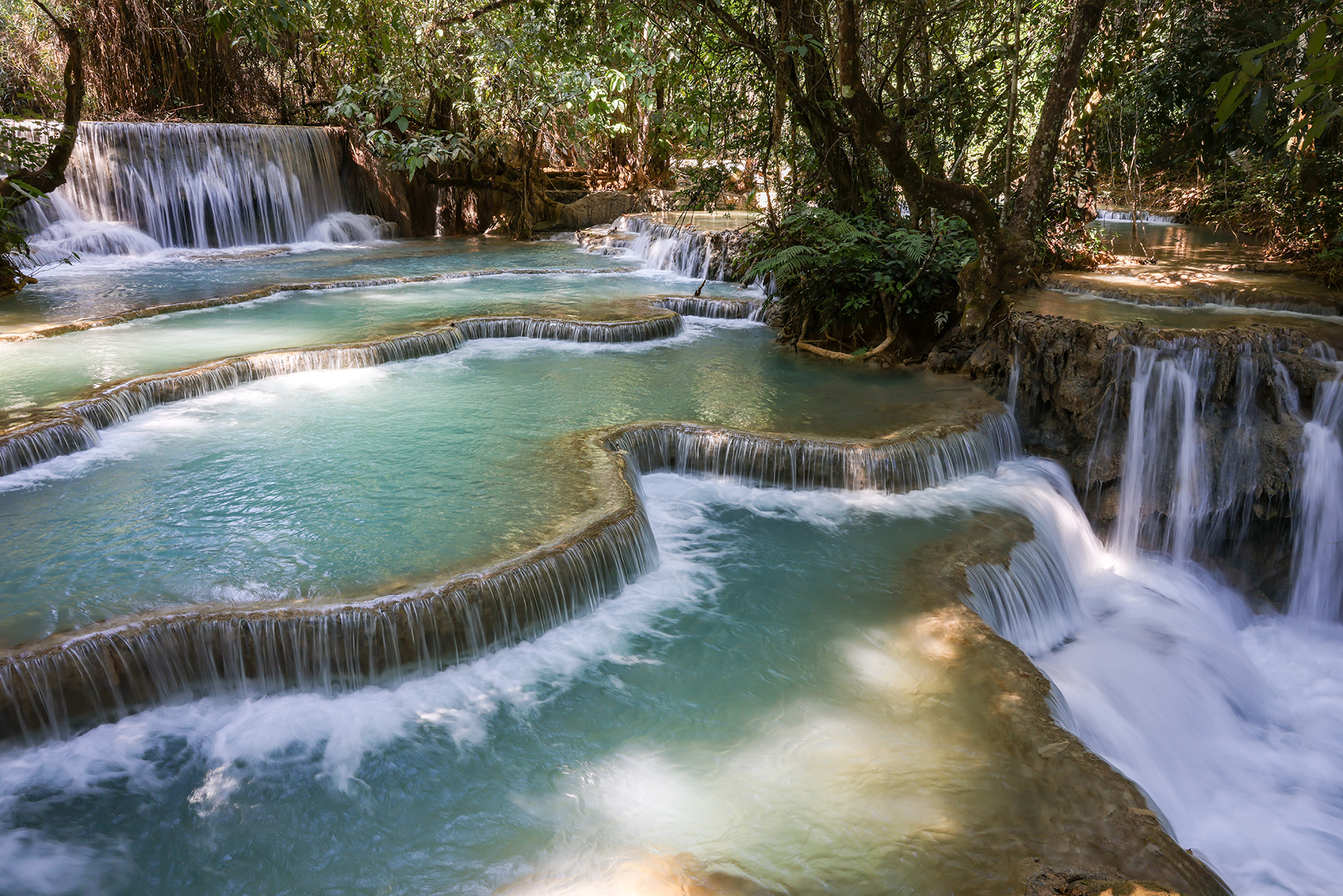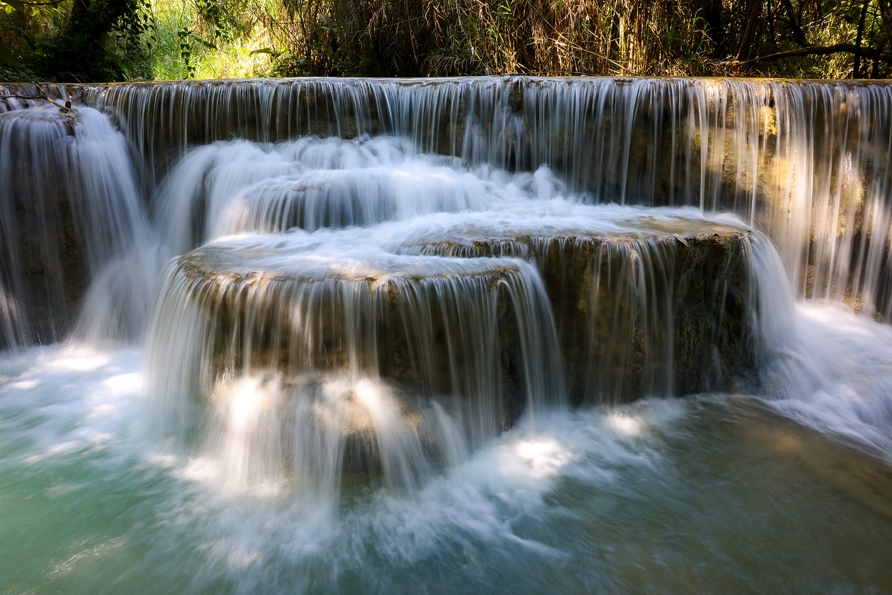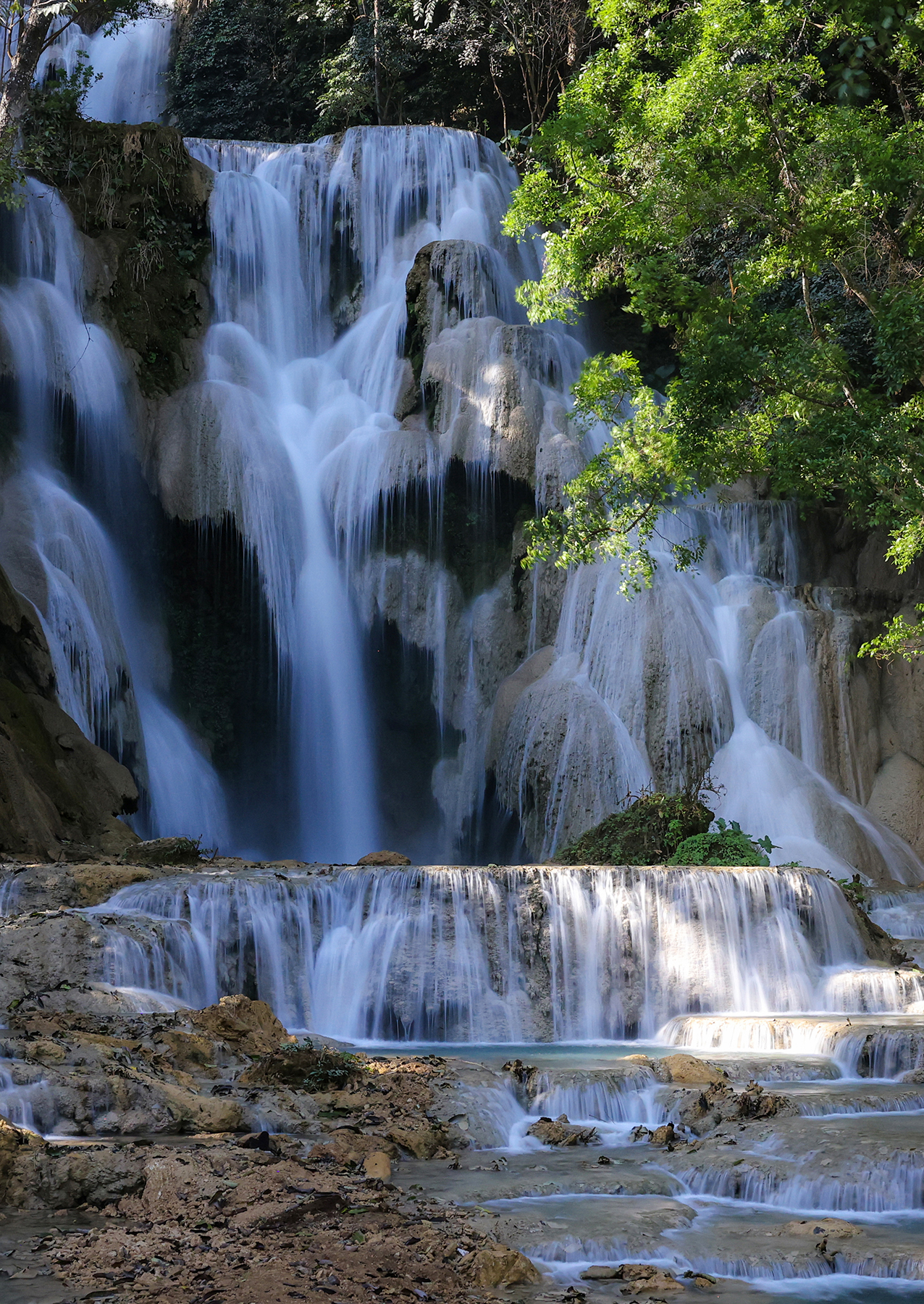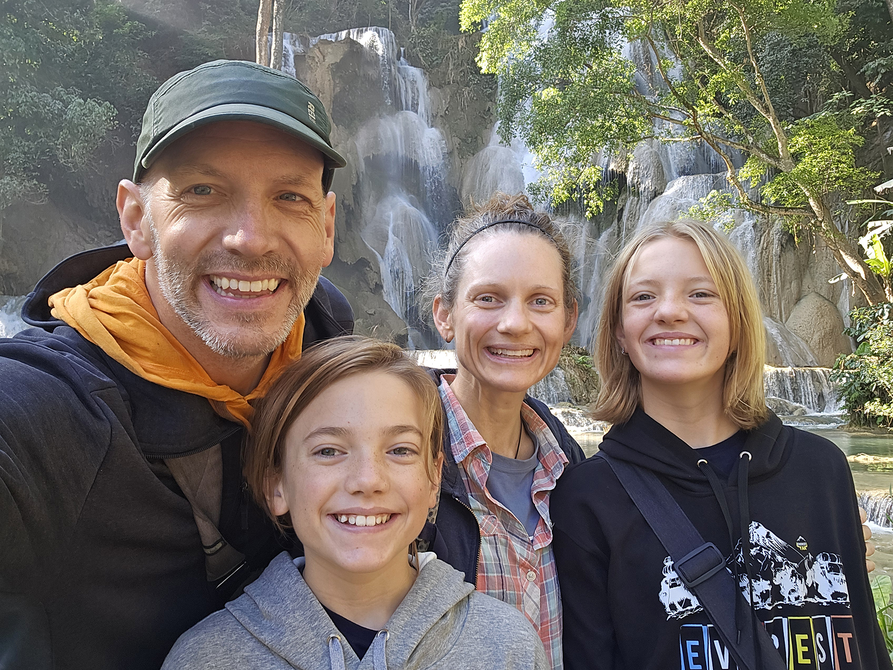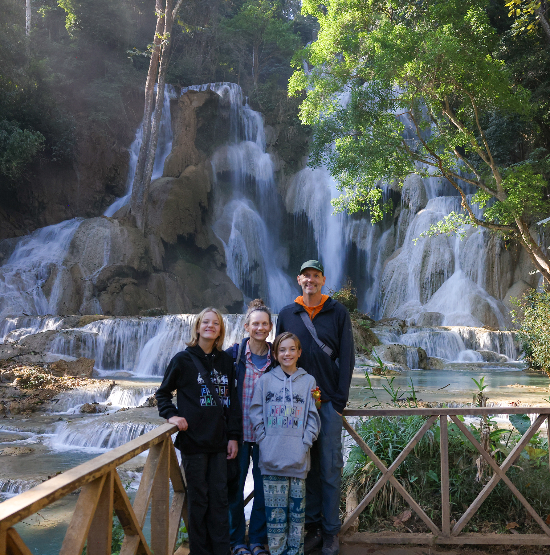 Our family also spent a day exploring the beautiful Kuang Si Waterfalls. The adventure began like most of our Southeast Asia adventures – by hopping on a songthaew (fancy Southeast Asia term for “pick-up truck where you pile in the back with way too many other locals and travelers – somewhat dangerous, but far safer than a motorbike”). After an hour of incredibly bumpy songthaew riding we hiked a short distance to the base of the spectacular multi-tiered waterfall.