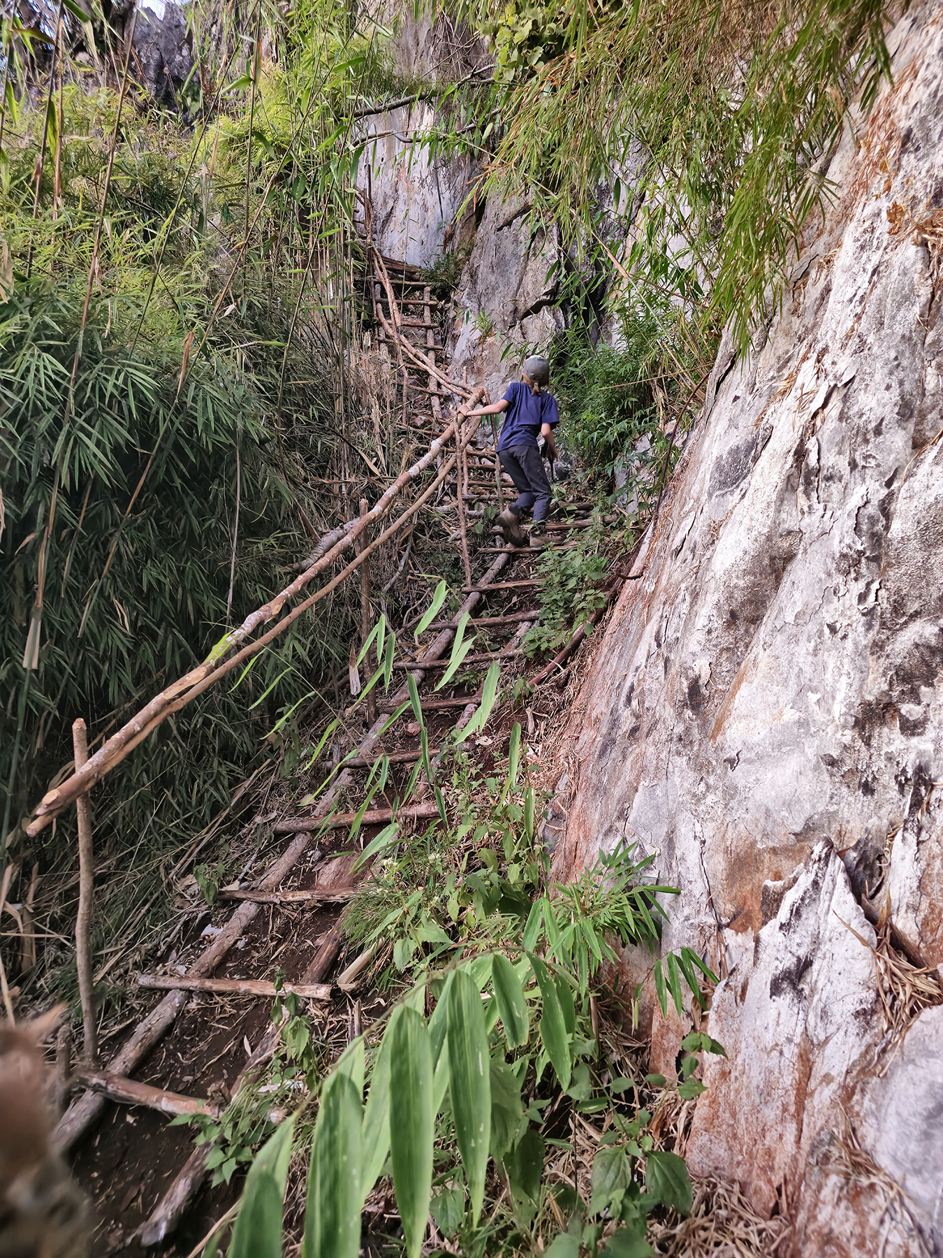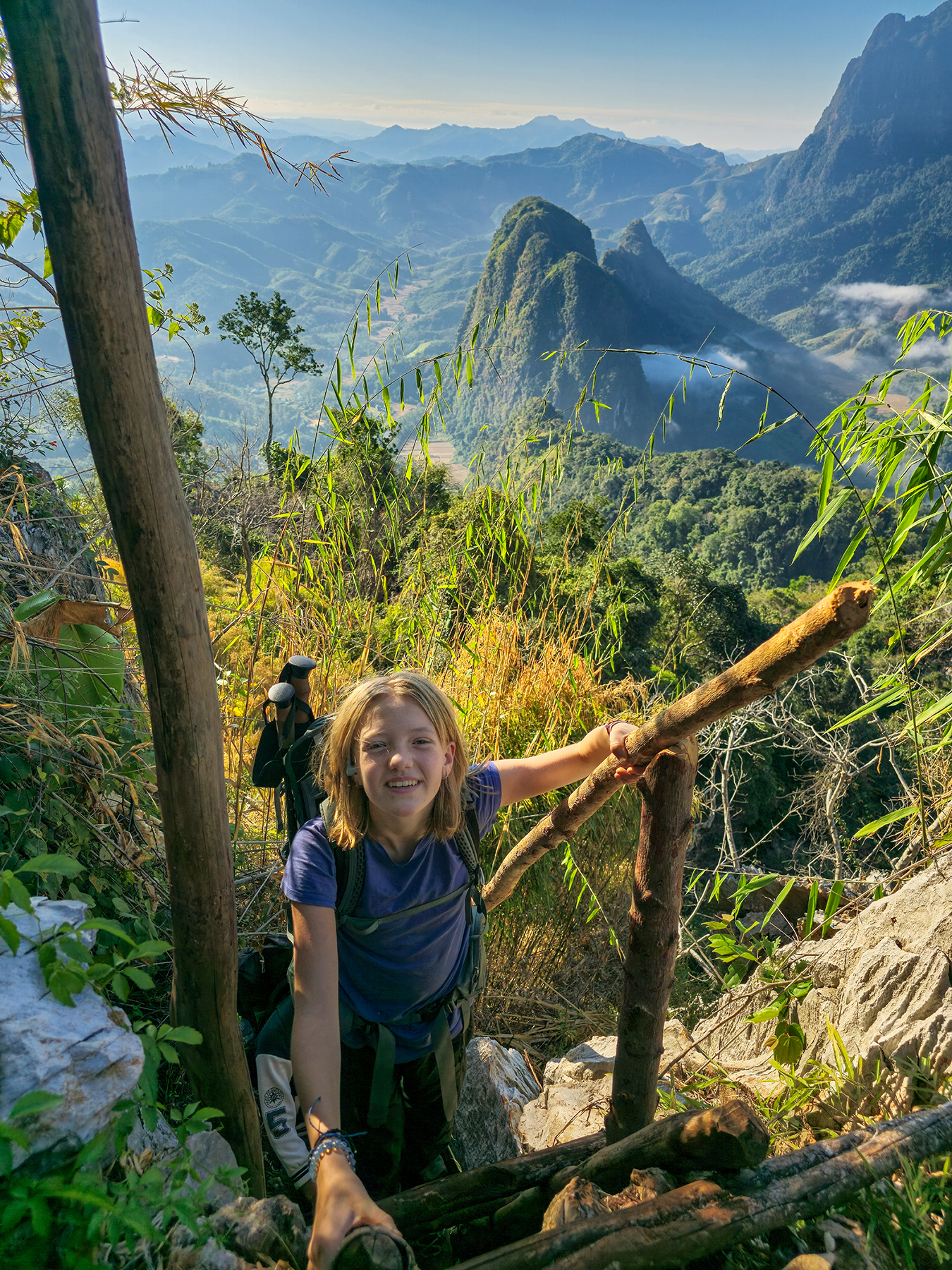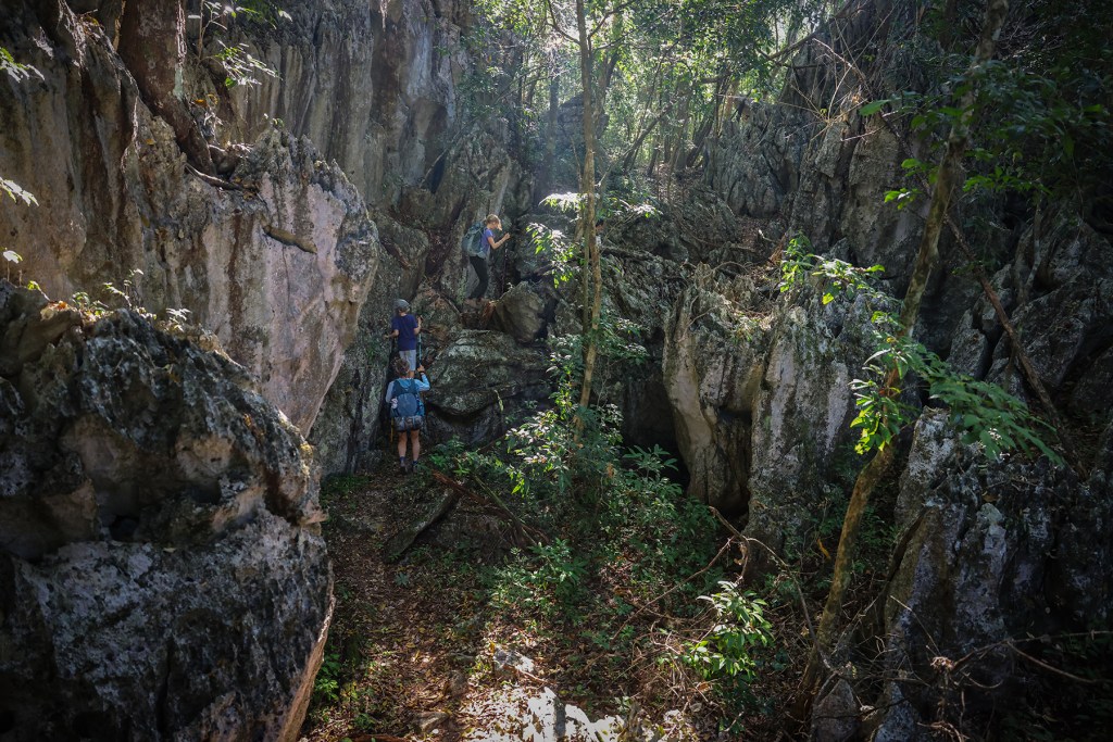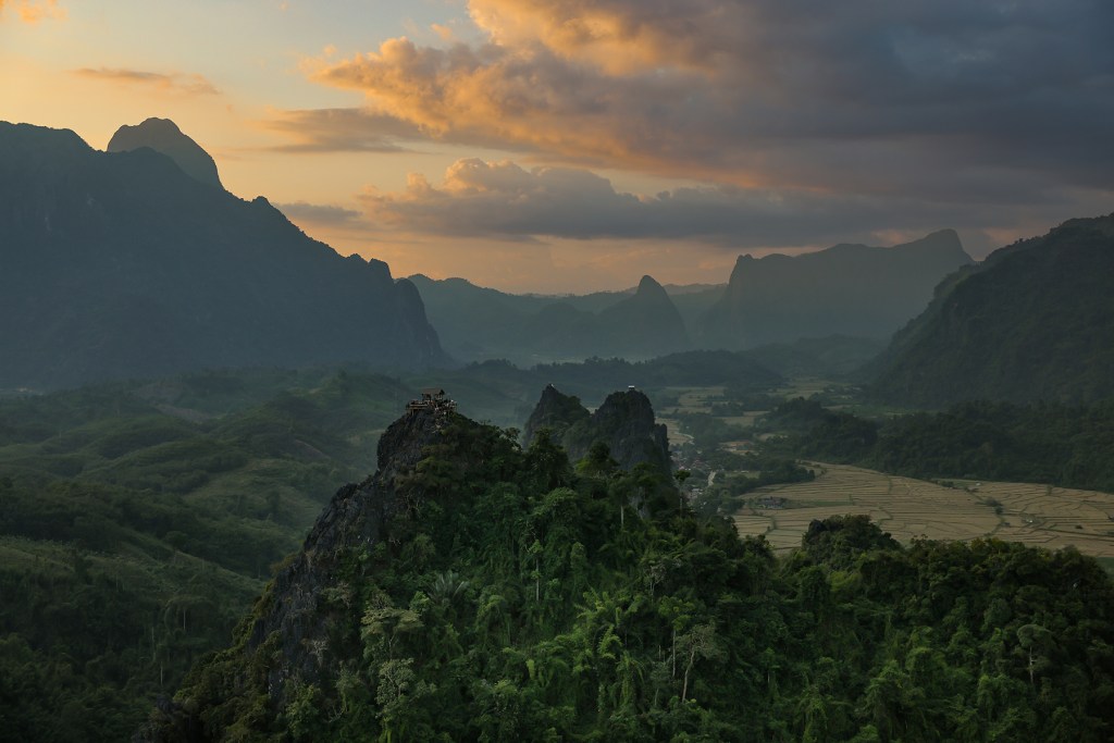 We were delighted to discover there were multiple viewpoints on the summits of the steep karst peaks which surround Nong Khiaw. Knowing the history of the region, presence of UXOs, and challenging trail finding, we found a company in town and hired a local “trekking guide” to accompany us to one of these summits – where we planned to watch the sunset and camp overnight.