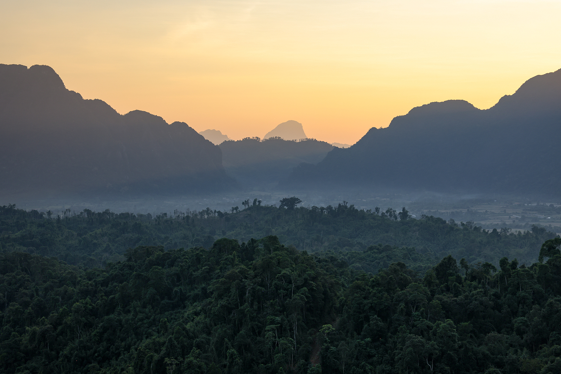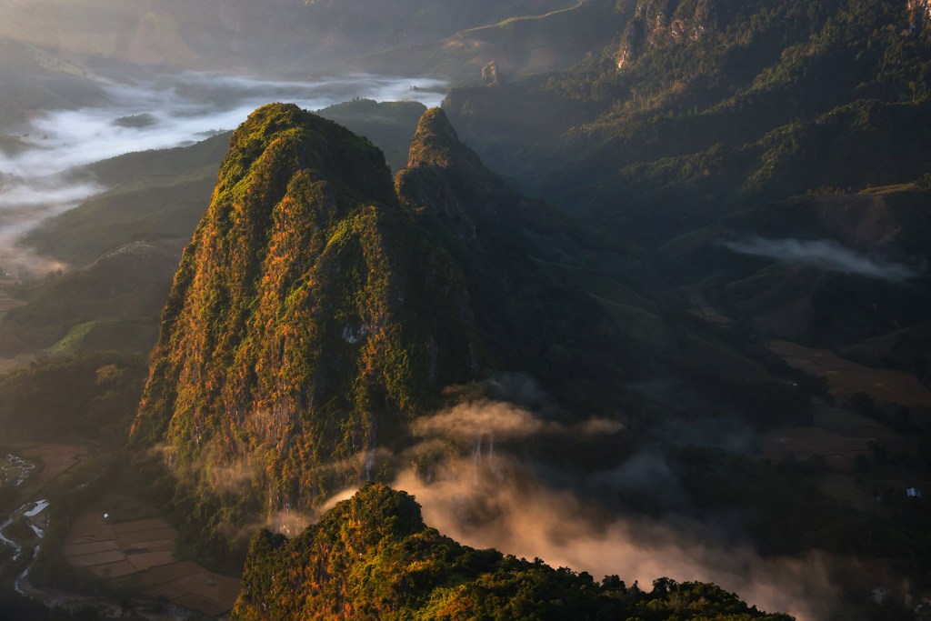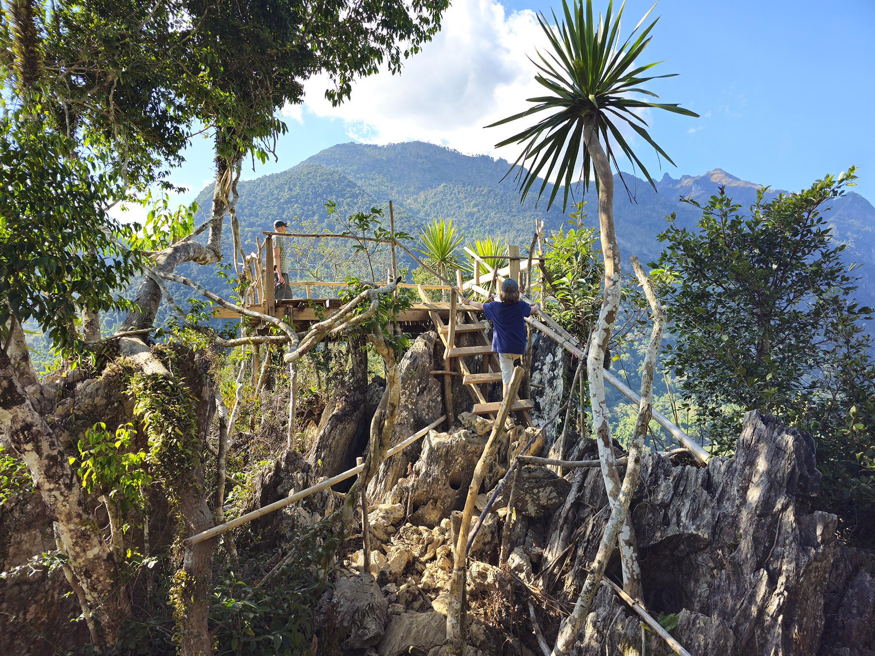 We were delighted to discover there were multiple viewpoints on the summits of the steep karst peaks which surround Nong Khiaw. Knowing the history of the region, presence of UXOs, and challenging trail finding, we found a company in town and hired a local “trekking guide” to accompany us to one of these summits – where we planned to watch the sunset and camp overnight.
