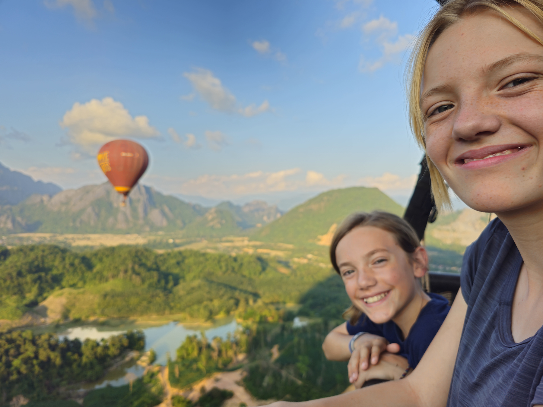 Hot air ballooning in Vang Vieng was another fantastic event. As we are accustomed to early morning hot air balloon adventures with Sonya’s dad, sunset ballooning was a completely new experience for us! The combination of the mountainous terrain, late starting time, super-high altitudes reached, and pilot who was not in-family (we are forever loyal to our Pop-Pops, balloon pilot extraordinaire!) made me somewhat more nervous than usual during the flight, but the trip was spectacular nonetheless.