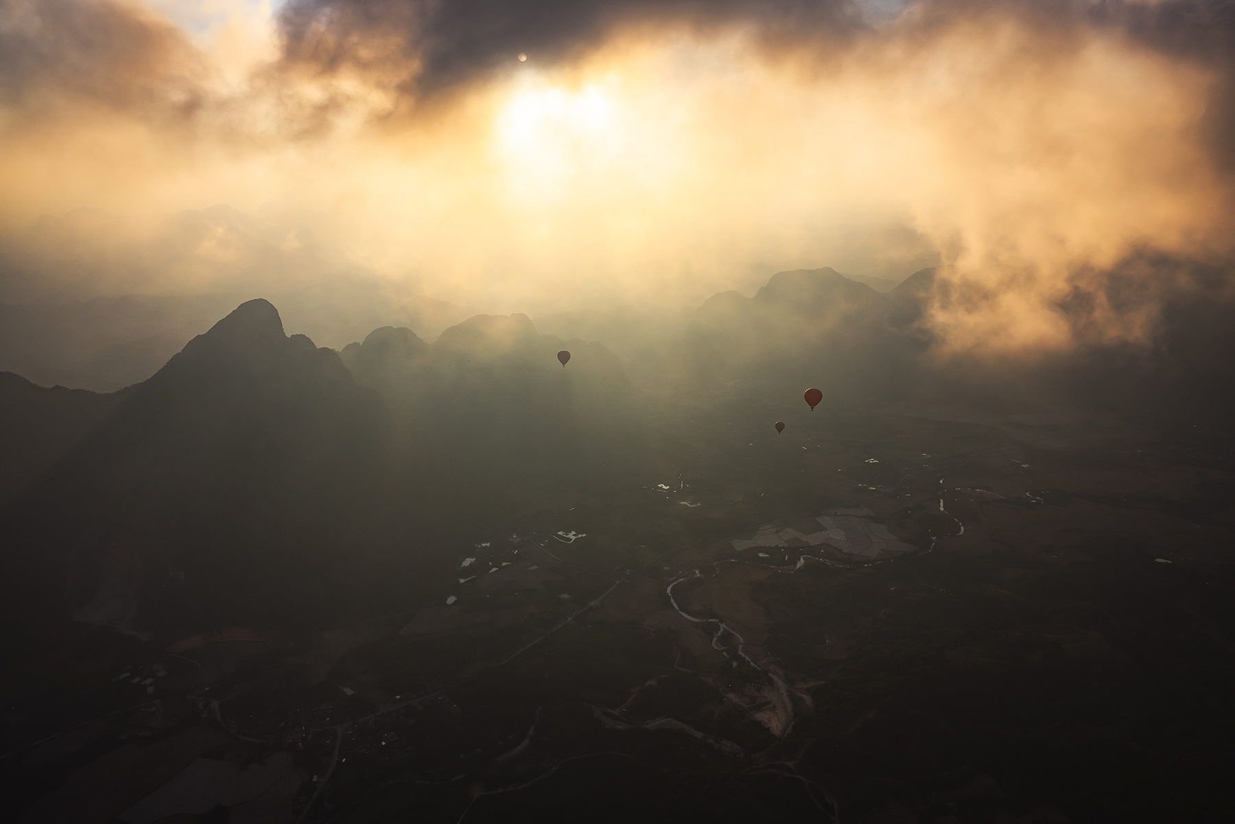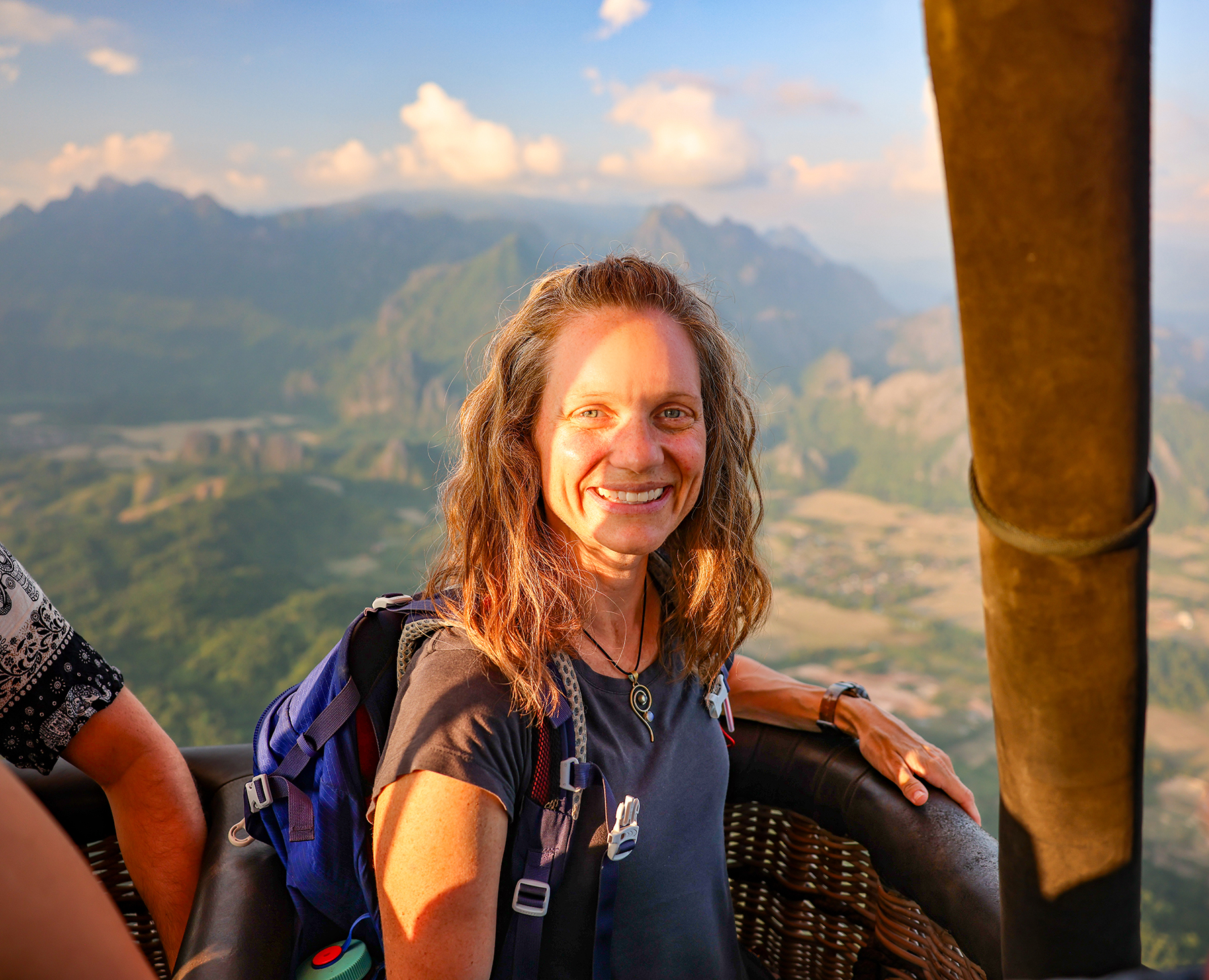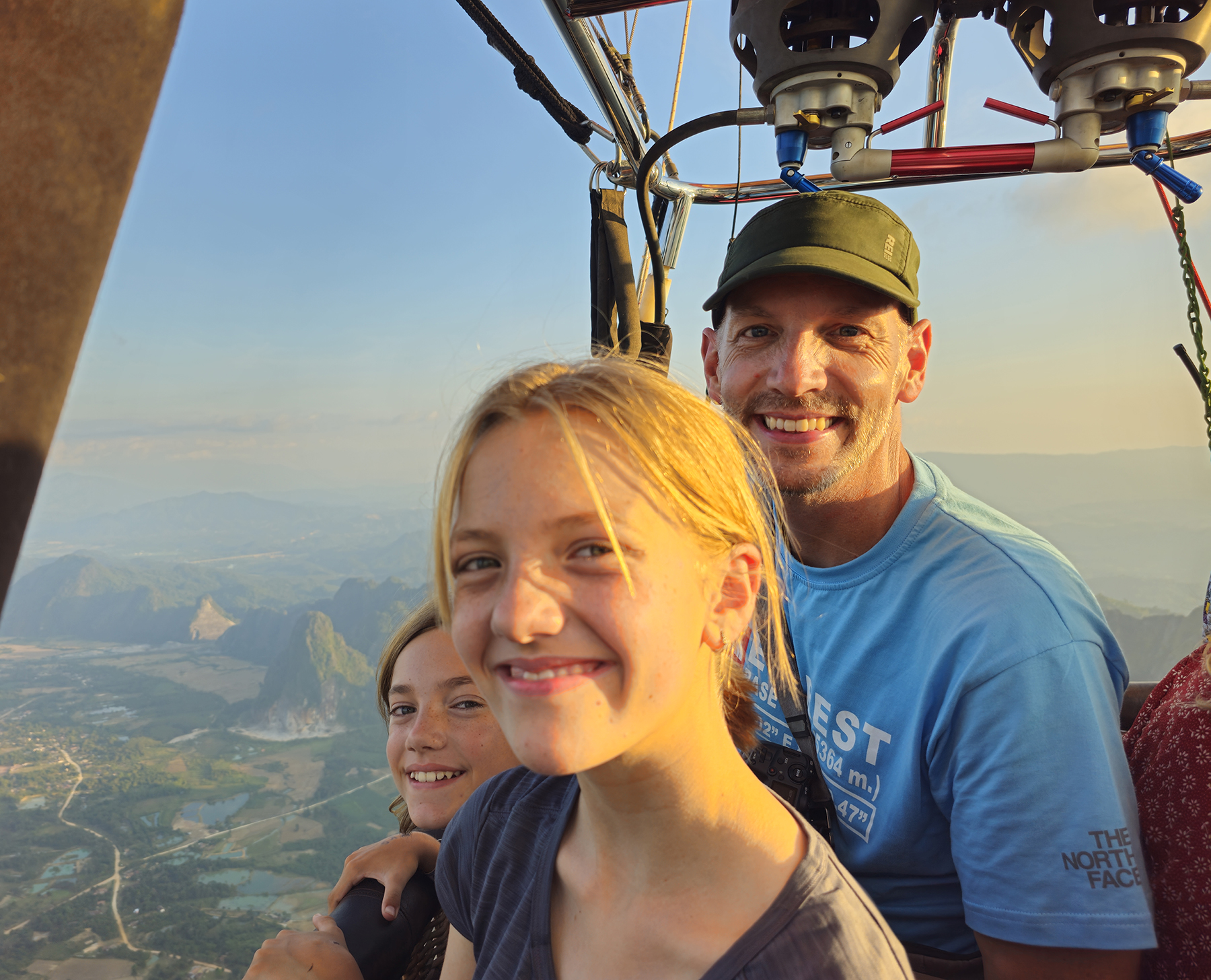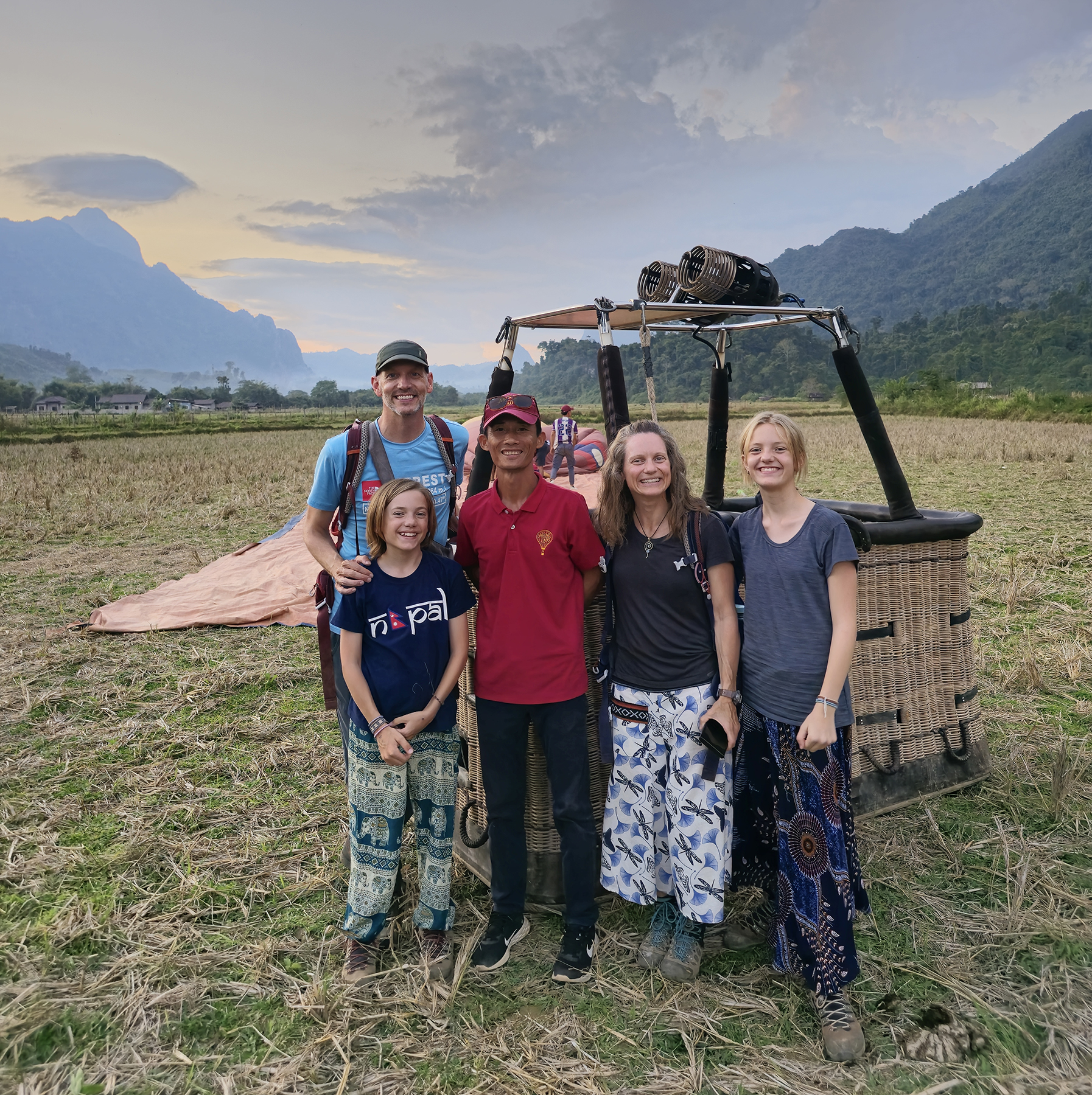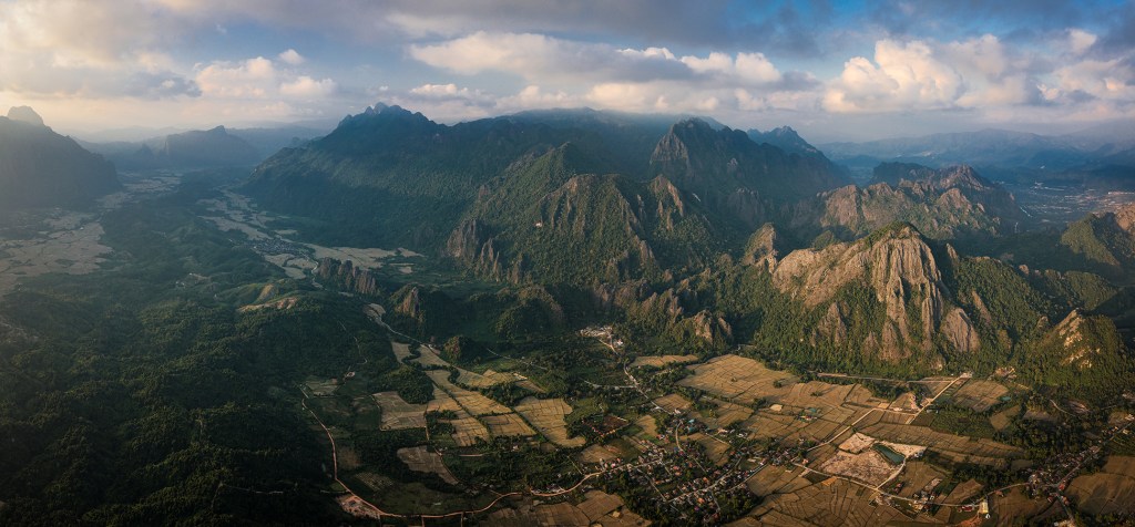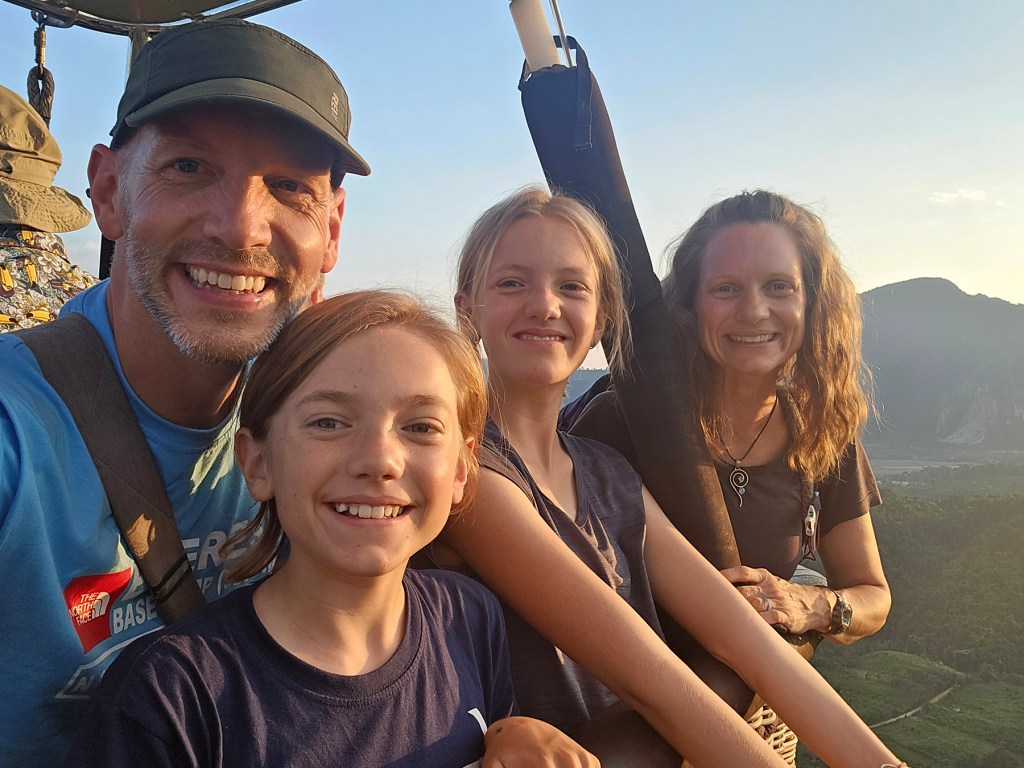 Nestled among steep karst peaks, Vang Vieng is strikingly beautiful. It’s an established stop for many backpackers in Laos and caters to visitors with activities including hiking, cave exploration, tubing, kayaking, paragliding, and even hot air ballooning. We had a chat with our personal hot air balloon pilot (my dad) and got the green light for taking a ride through the mountainous Asian countryside. What an amazingly unique experience – flying over and through the karst landscape as the evening sun set!