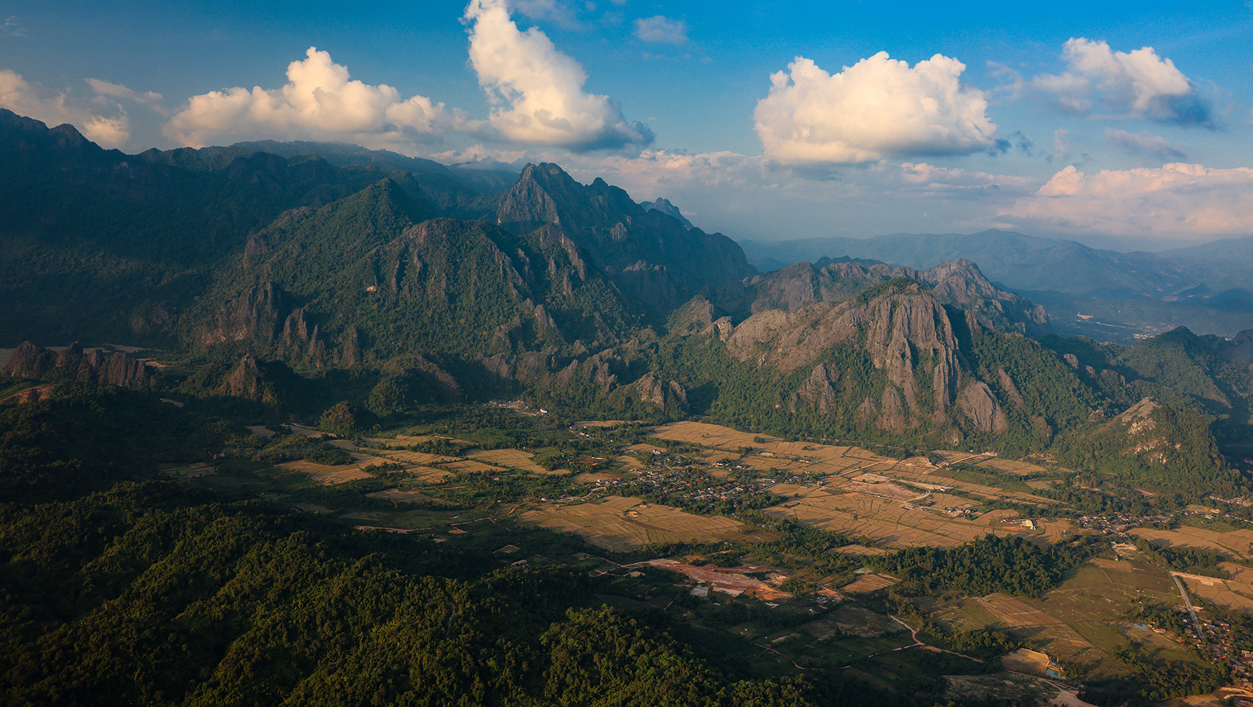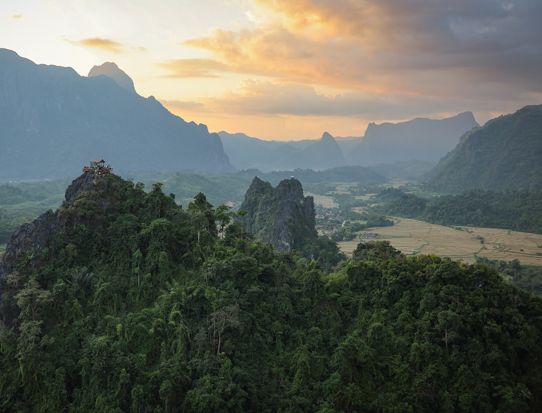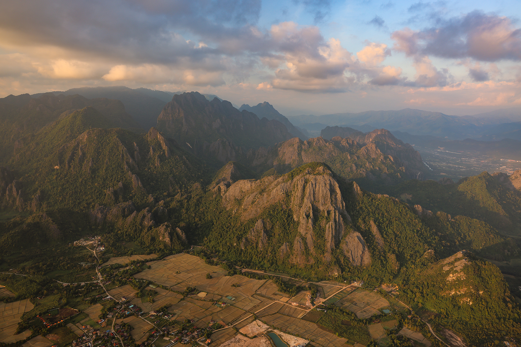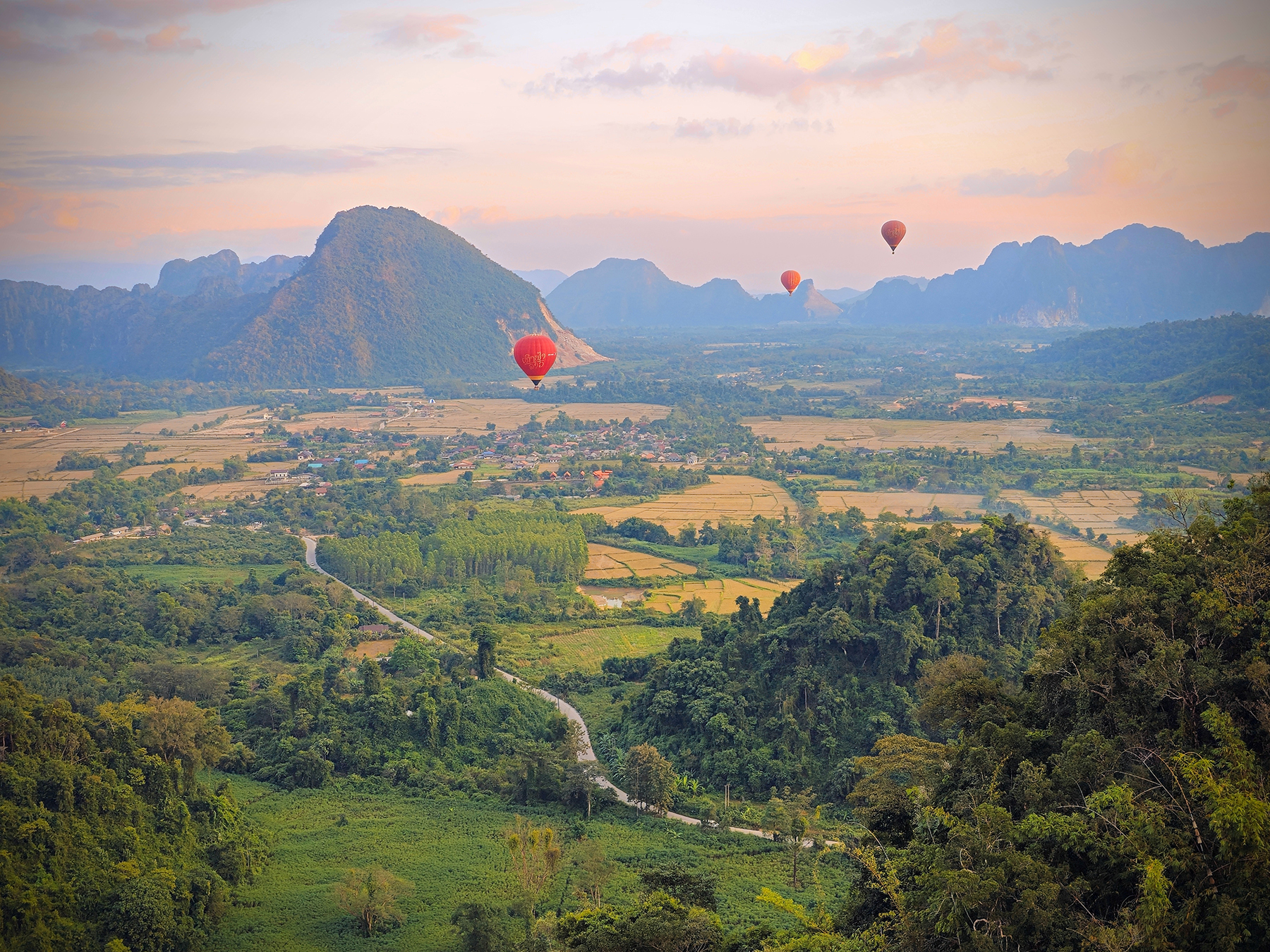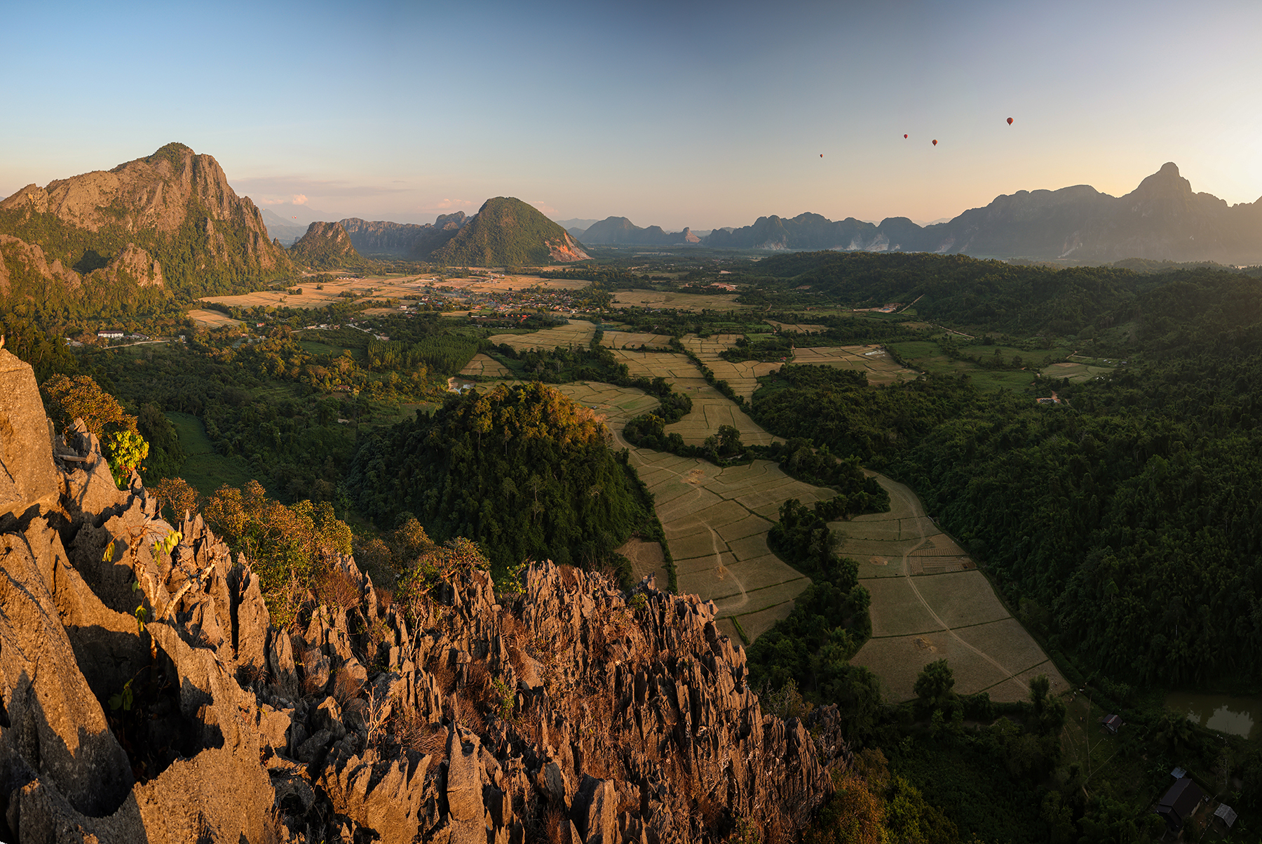 Nestled among steep karst peaks, Vang Vieng is strikingly beautiful. It’s an established stop for many backpackers in Laos and caters to visitors with activities including hiking, cave exploration, tubing, kayaking, paragliding, and even hot air ballooning. We had a chat with our personal hot air balloon pilot (my dad) and got the green light for taking a ride through the mountainous Asian countryside. What an amazingly unique experience – flying over and through the karst landscape as the evening sun set!