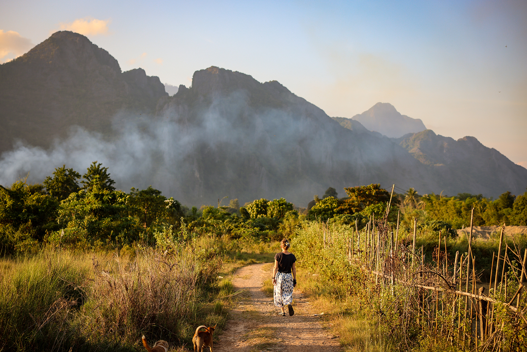 One morning while staying in Vang Vieng, we walked a couple of blocks from our accommodation to have breakfast. While eating our mango and omelets, H looked across the street: “Why are there those random clothes hanging on the dirty fence? Are they for sale, or like what’s going on?”