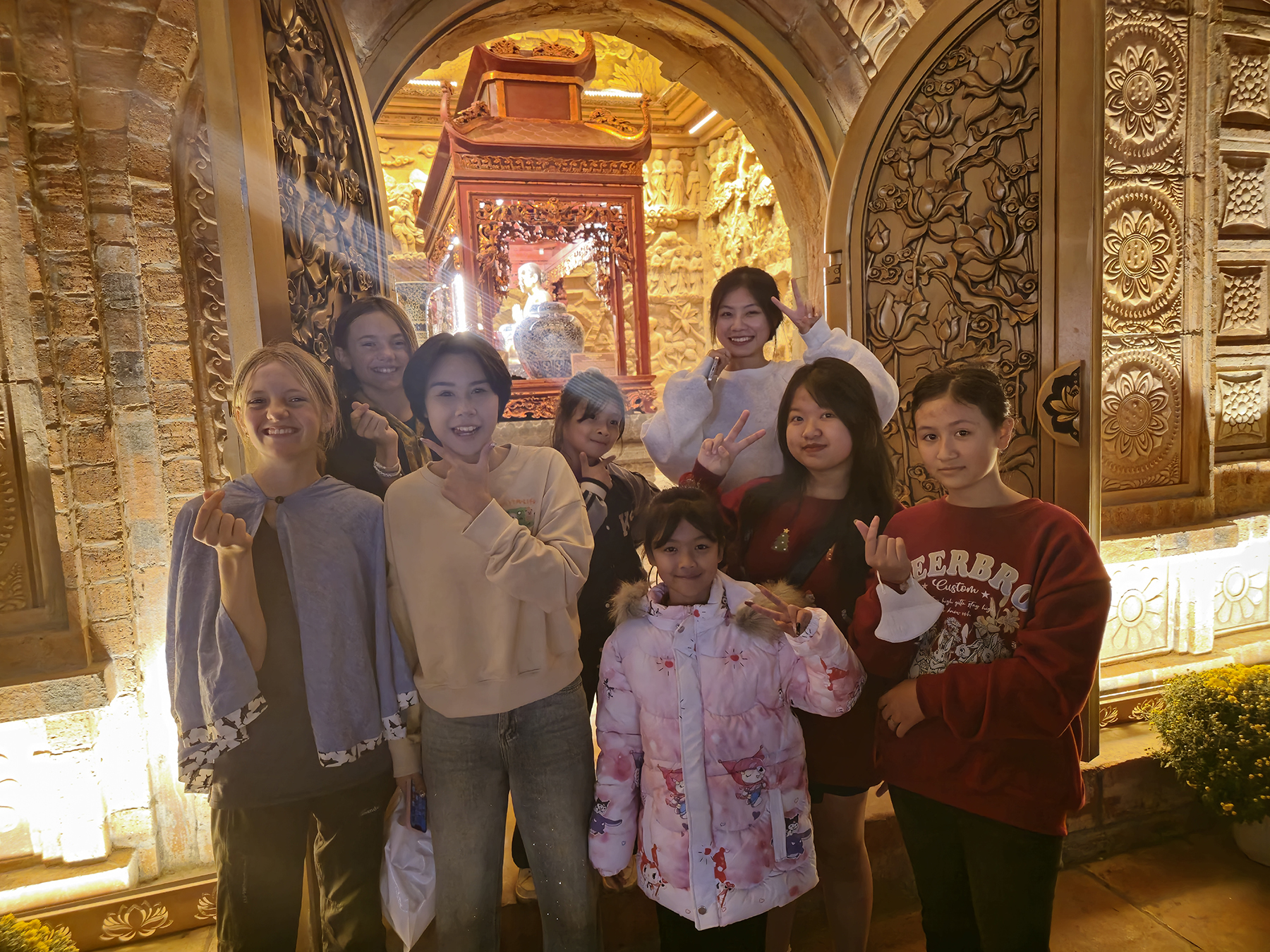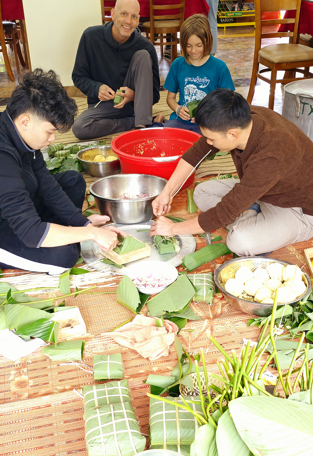 It was incredibly special for our family to be living in a homestay with a local family during Têt (Vietnamese/Lunar New Year). They enthusiastically included us in their traditions – we made banh chung/tet (banana leaf, sticky rice, and pork “cakes”), drank homemade wine, spent one night singing very loud and ridiculous karaoke, and enjoyed the amateur New Year’s pyrotechnics display set off from their roof.