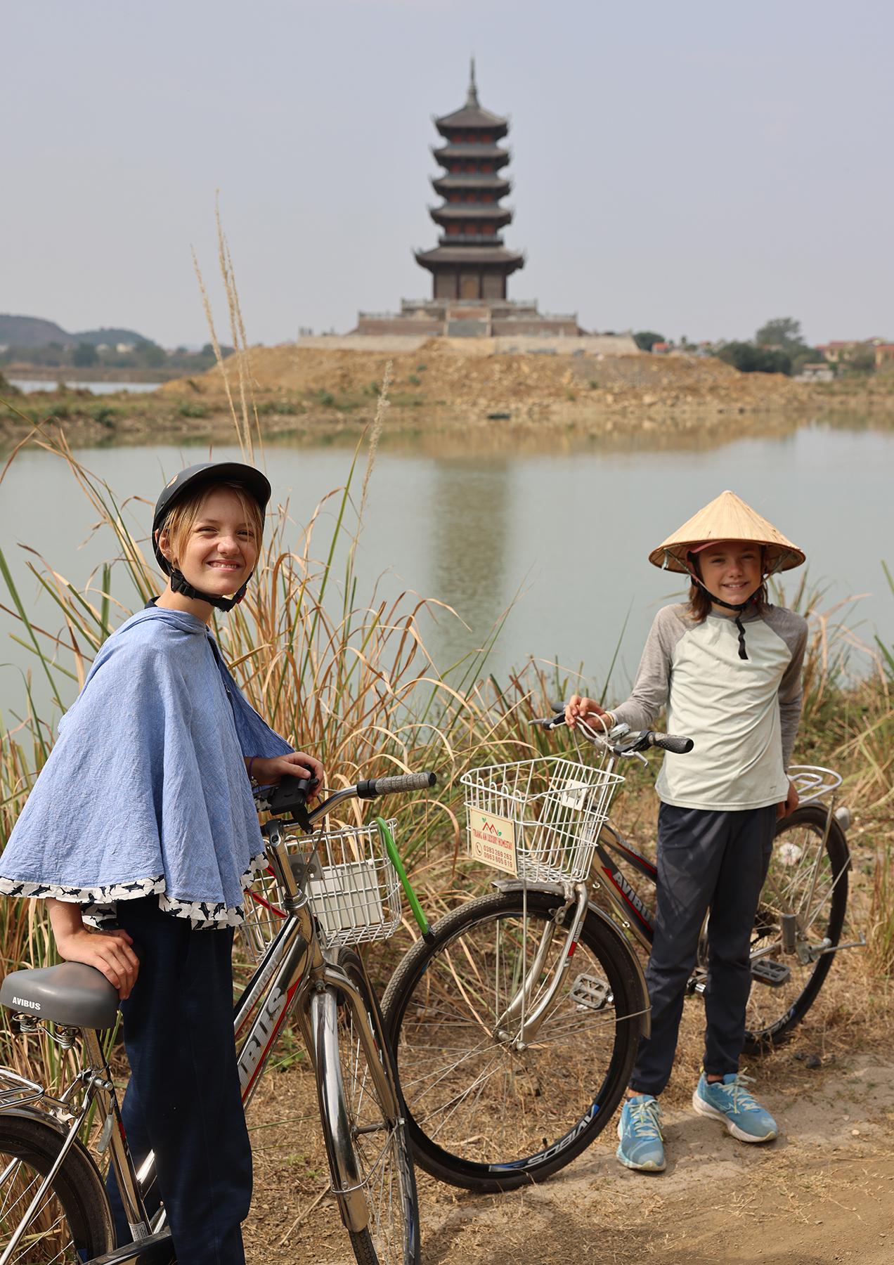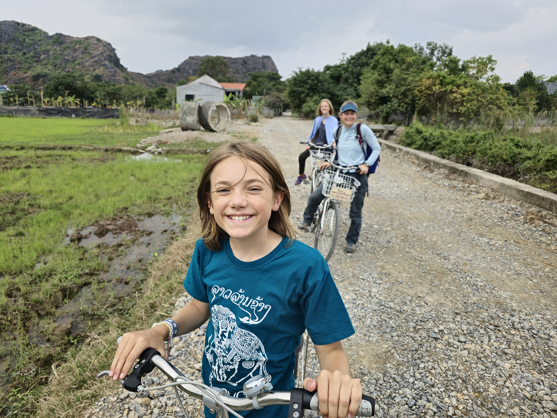 For the next week and a half, we stayed in a homestay in the mountainous area near Ninh Binh. Our hosts were a lovely Vietnamese family with three children, a cat (who had a litter of kittens while we were there!), and the tiniest dog known to all of humankind. They prepared breakfast for us each morning and then gave advice for the day’s adventures. They also provided us with bicycles, and many days were spent exploring the gravel backroads through the countryside. These daily family bicycle journeys were a highlight for me… although riding behind our kiddos as they tried to keep control of their “one size fits all” bikes on gravel roads with minimal maintenance was definitely nerve-wracking at times.