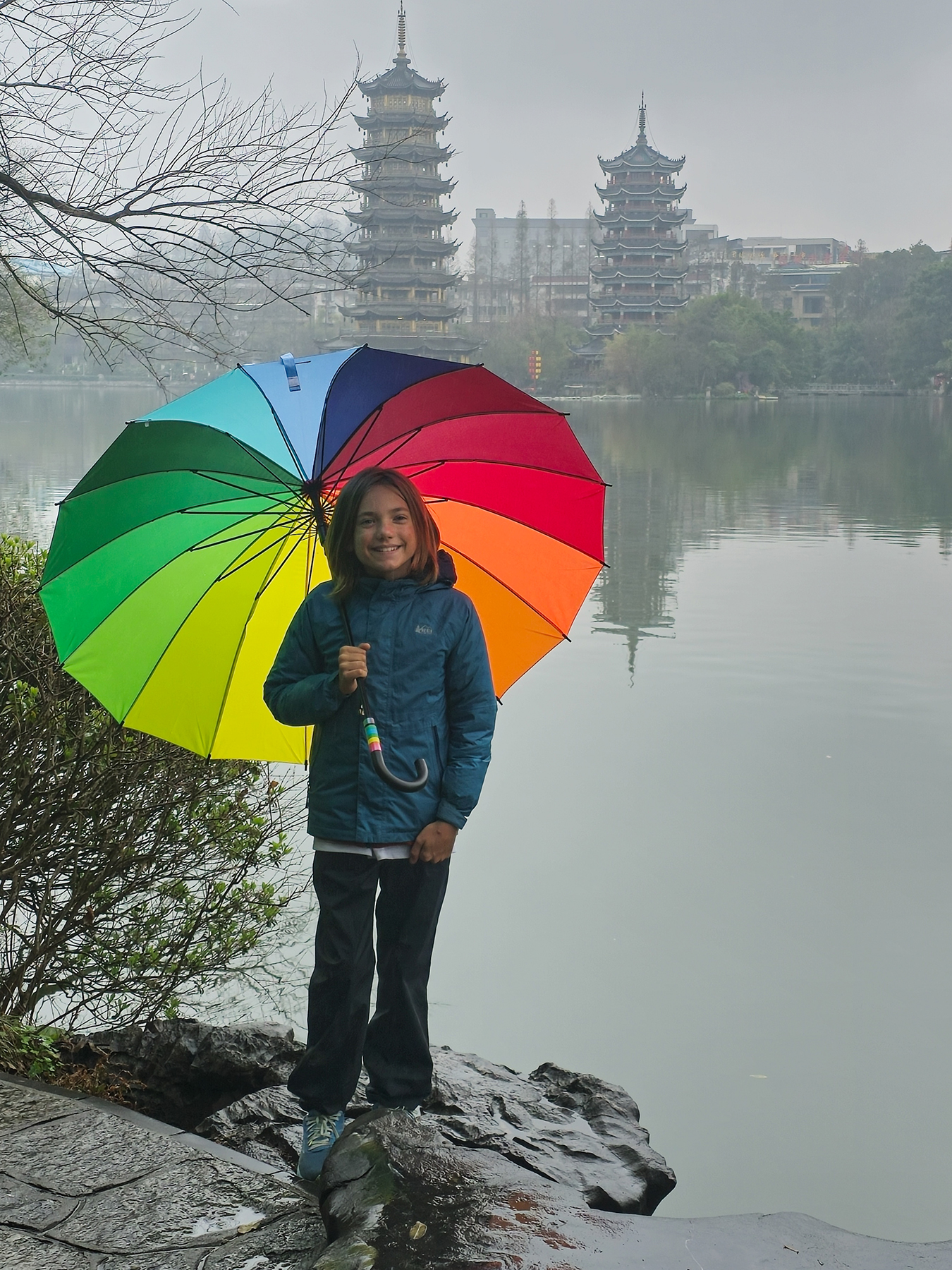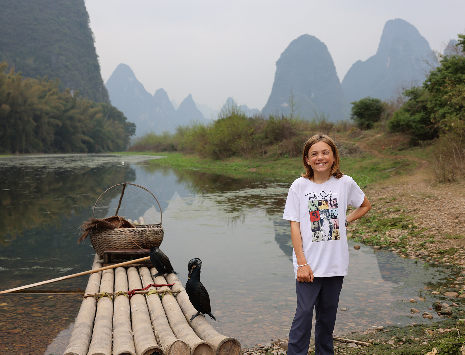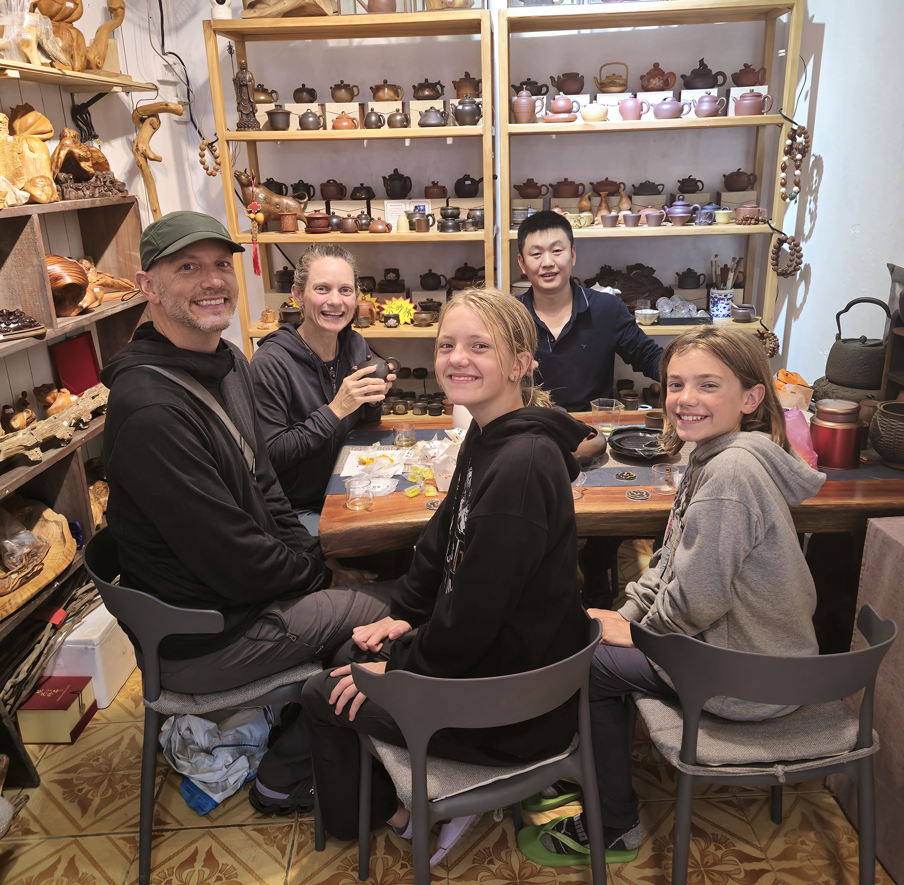 Next up we took the high speed train to Xingping, a location we had loved during our first trip to China. Now that the kiddos were older, we wanted them to have fully formed memories of this place, as they were so small during our first visit. The karst landscape was as spectacular as ever, but unfortunately the weather alternated between a dreary overcast sky and rain for our entire visit. Happily, our accommodation doubled as a local cat cafe, and the kiddos were delighted to spend some time indoors with the feline friends. Despite the poor weather, we still enjoyed a hike up to the summit of Laozhai Hill to look out over a landscape that could have been lifted from an ancient painting. We followed up our hike with a day of travel in a 6-passenger microbus around the karst landscape to search out various viewpoints along the Li River, including the famous Nine Horse Mountain. While in Xingping we were also warmly invited to join a kind gentleman for an evening drinking and learning about tea. As we sampled different varieties and drank cup after cup the kiddos were showered with amazing treats by the man’s sweet mother, including a new favorite snack that reminded us of a rose flavored rice krispy treat. Using our translate app made connecting with people so much easier than it had been during our previous visit, and we found people to be consistently kind, helpful, and eager to share their country with foreign visitors.