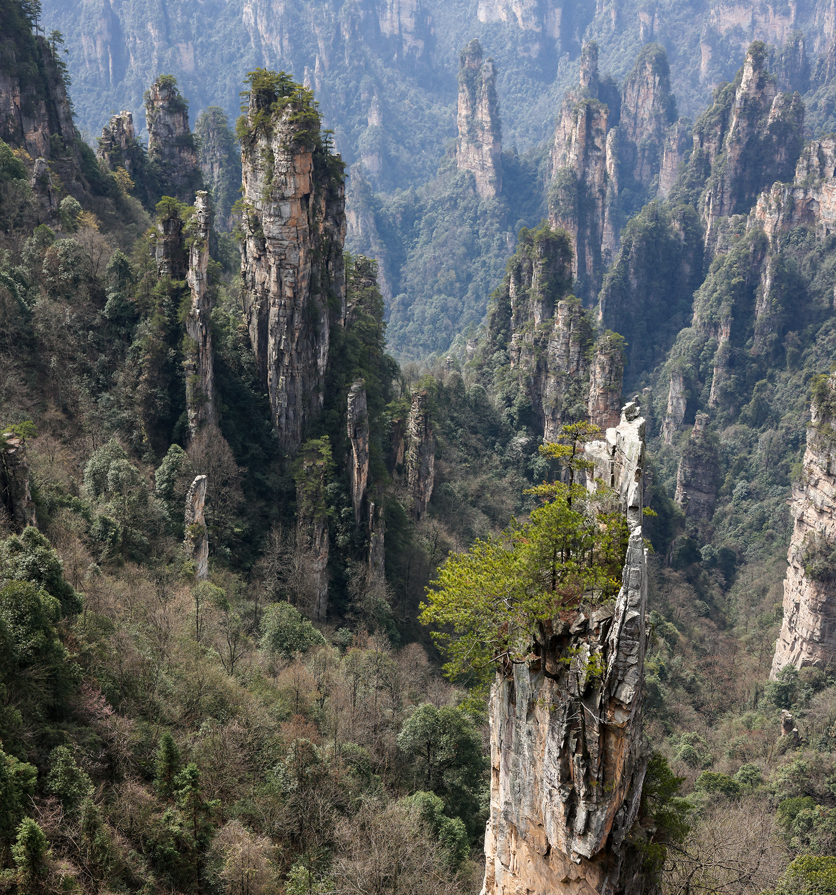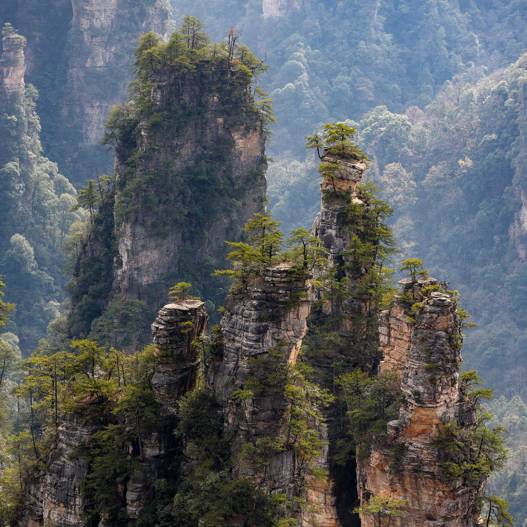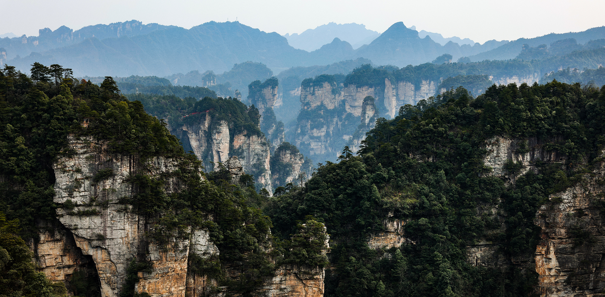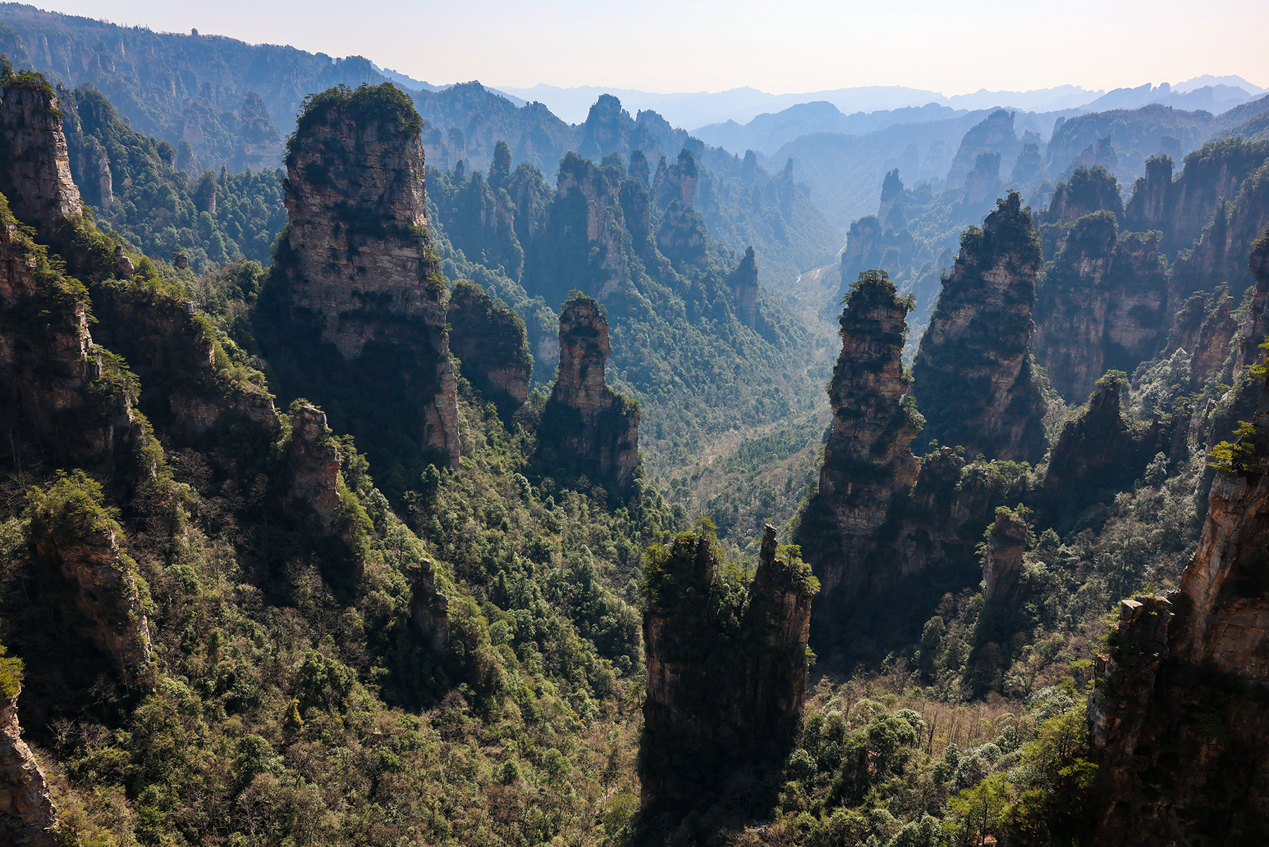 After departing from Xingping we took another train from Xingping to Zhangjiajie, another spot we had visited on our previous trip. Zhangjiajie is one of the most spectacular geologic sites on the entire planet, and as such has a well developed infrastructure to accommodate huge numbers of tourists. As much as we love the landscape, we are not too keen on hiking among large crowds, so we went about devising a plan to find some quiet moments in the park. Our plan was to stay within the park boundary overnight so we would not have to take the sequence of buses and gondolas that most people use to access the trails inside the park. Luckily, Sonya was able to track down a tea plantation within the park boundary that seemed to sometimes welcome visitors for overnight stays. The plantation turned out to be the only accommodation within the park boundary, and sadly it was permanently shut down by the government just three days after we left! We were fortunate to enjoy quiet walks through the forest to and from the plantation to reach the main hiking trails, and we also benefited from some great advice from the man running the plantation on tracking down a number of quiet secret spots in the park. Almost all the domestic tourists seem to travel in large organized tours, so once we got off the main route we found the trails to be nearly empty!