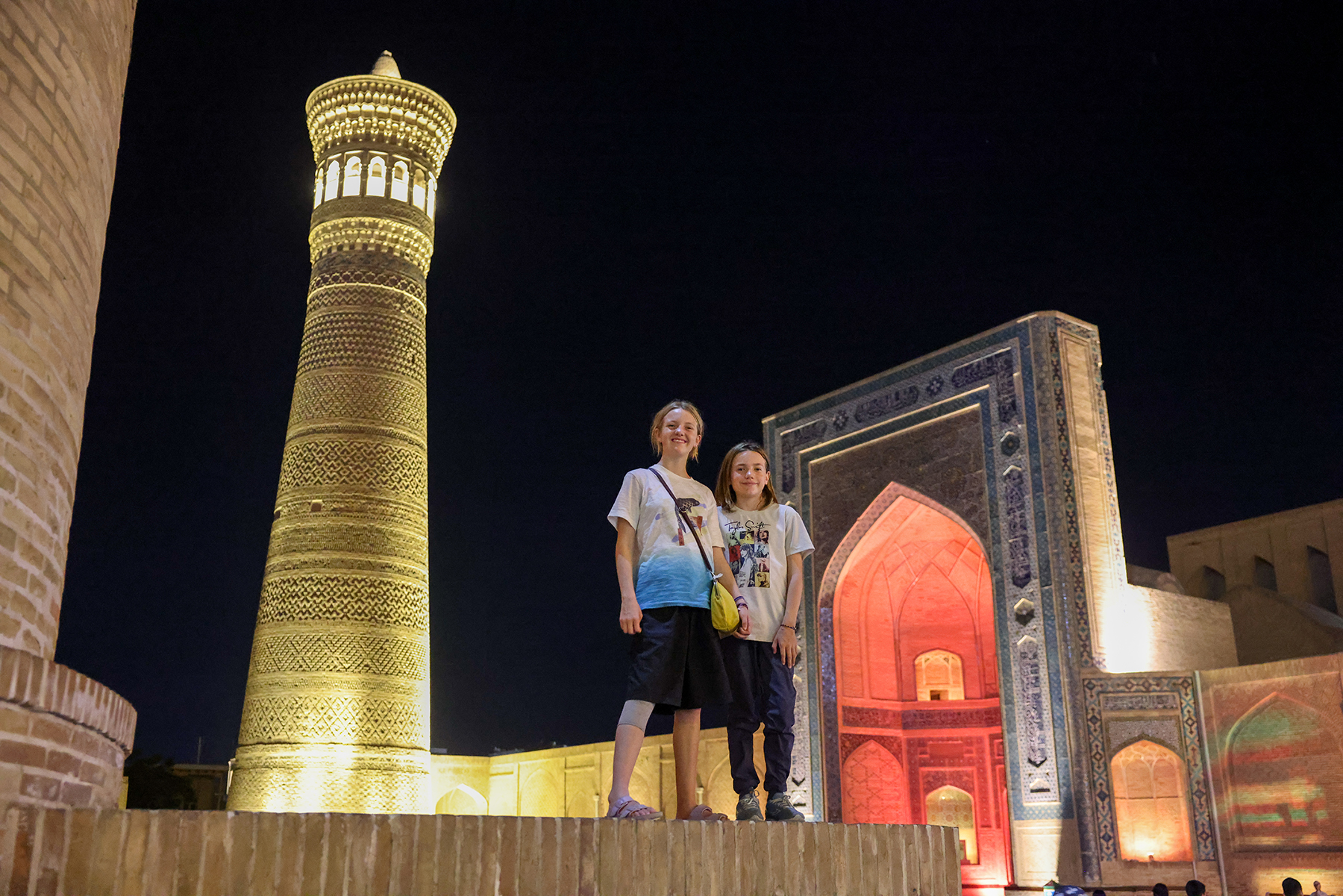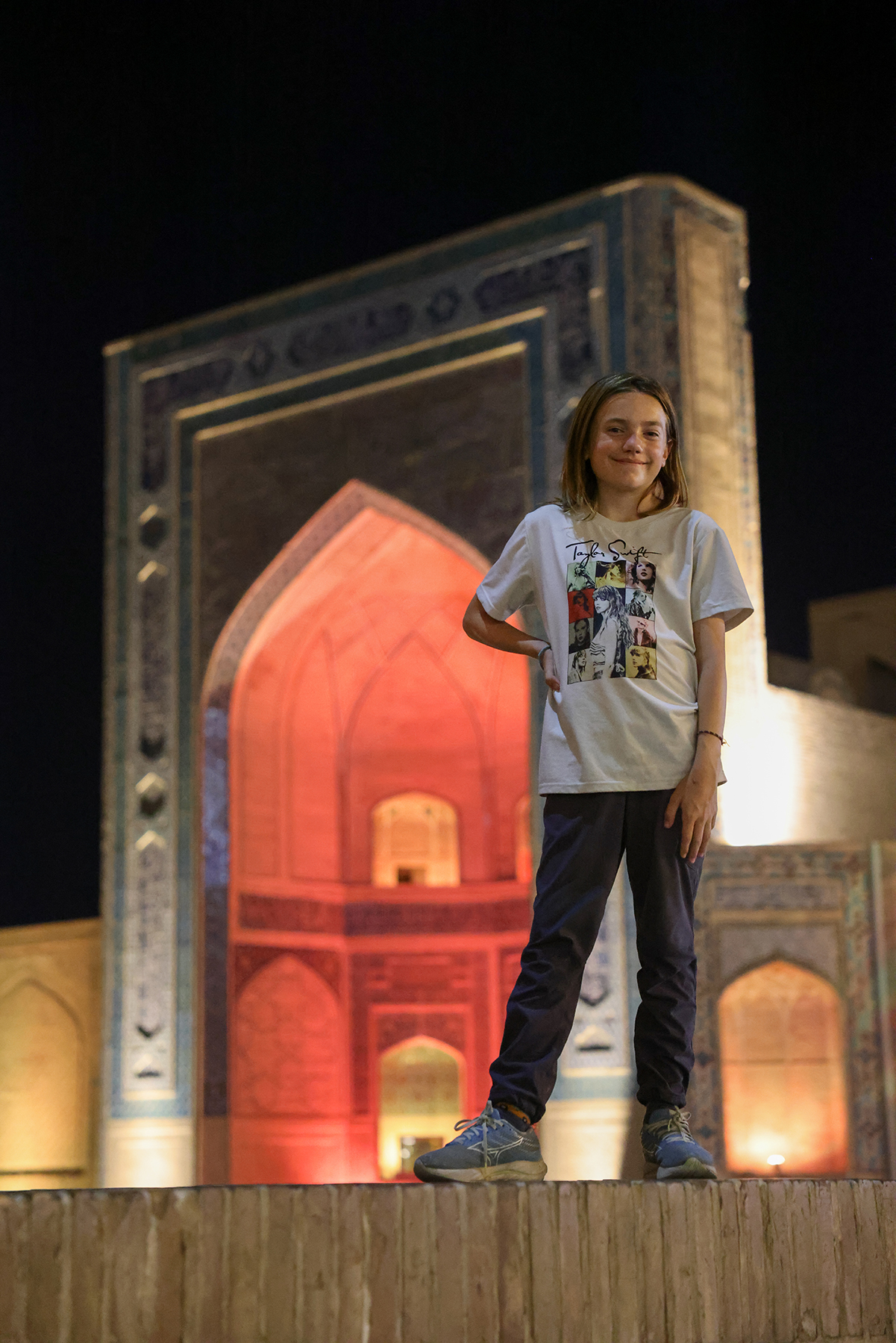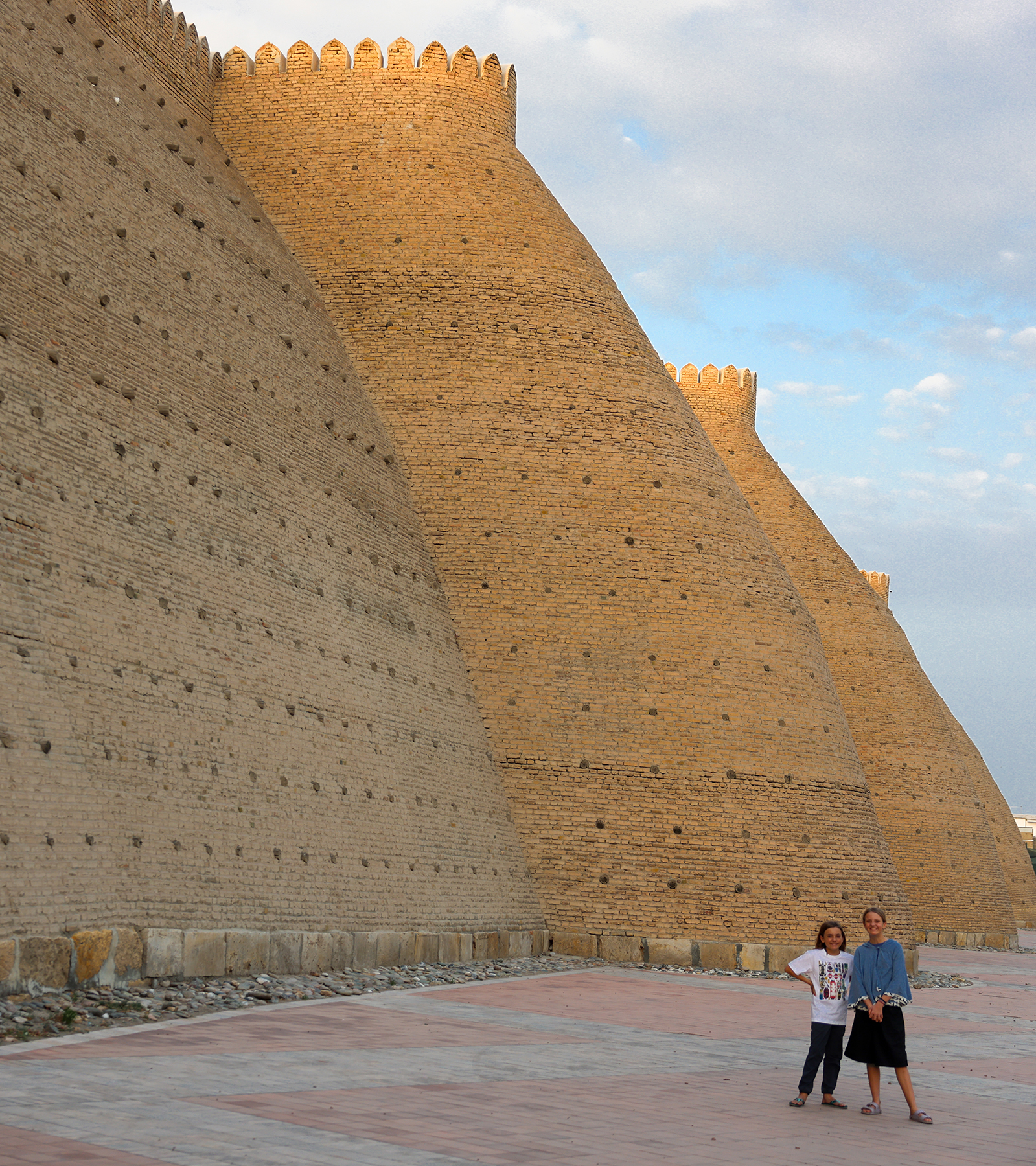 Enjoying the sunset from the high fortress walls on the Ark of Bukhara. Over 1,500 years old, this massive fortress once housed royal families until the early 20th century. Today, it stands as the most well-preserved ancient stronghold in Central Asia. An evening family walk along its upper walls offered breathtaking views over the historic city below.