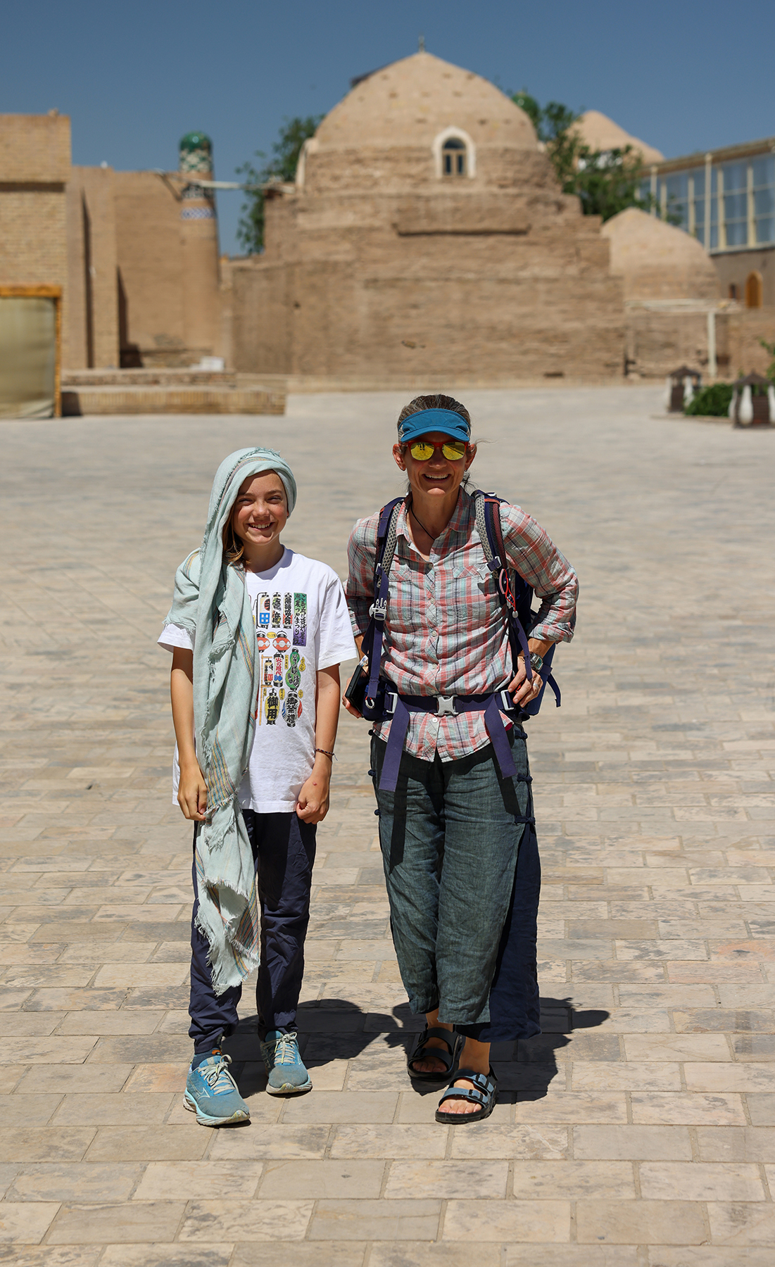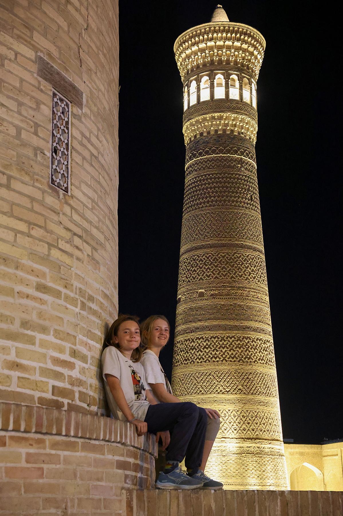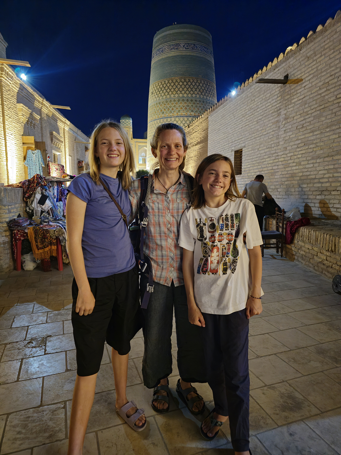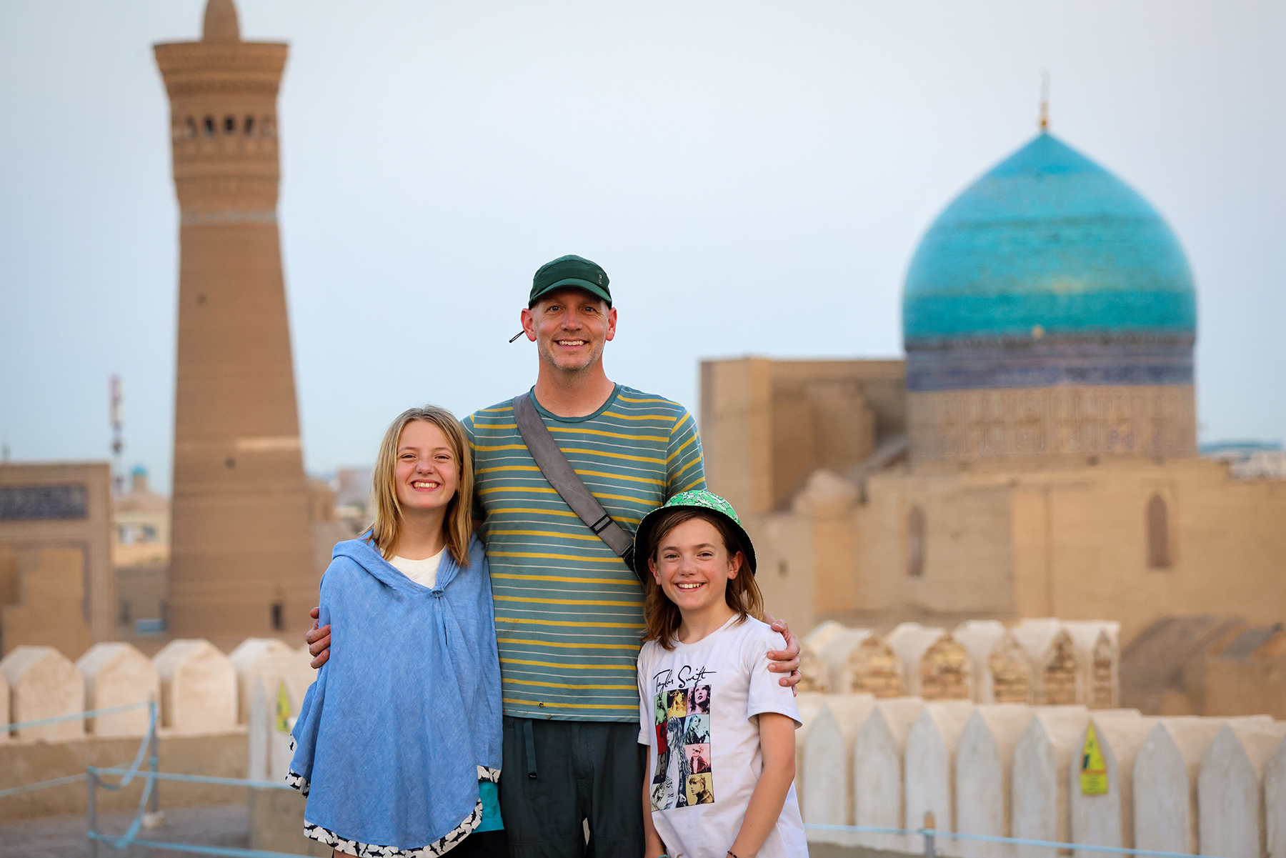 Our family loved exploring the car-free center of Itchan Kala in Khiva, especially during the late afternoon and evenings as the light (and temperature) faded. Some of my favorite moments were spent at our favorite rooftop restaurant, eating plov (a rice pilaf dish) and shashlik (kebabs) as we looked out across the square towards the madrasahs, the enormous unfinished Kaltaminor minaret, and Konya Ark. We concluded our time in Khviva with a final climb to the top of the Islam Khoja Minaret for a sweeping view out over the ancient city.