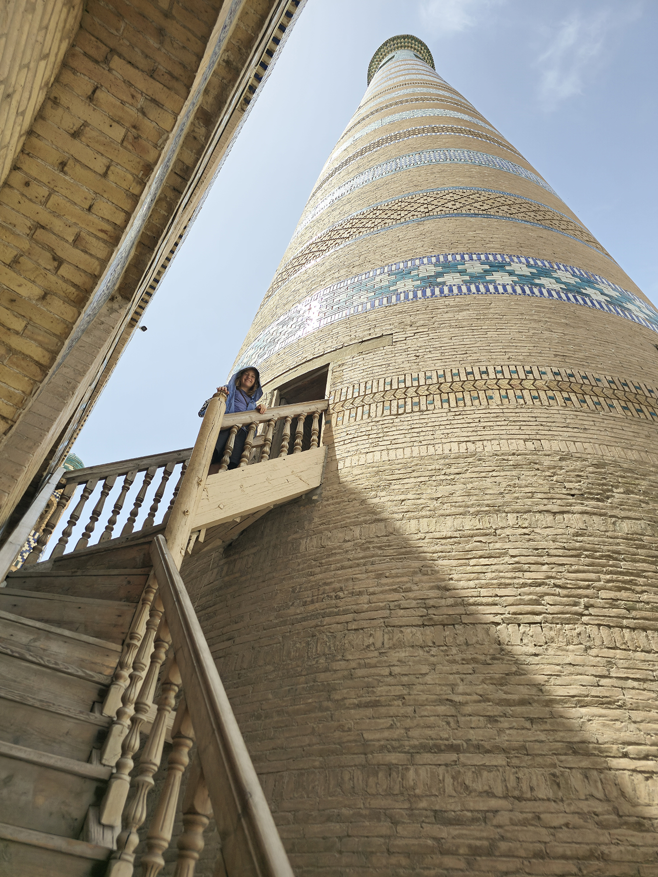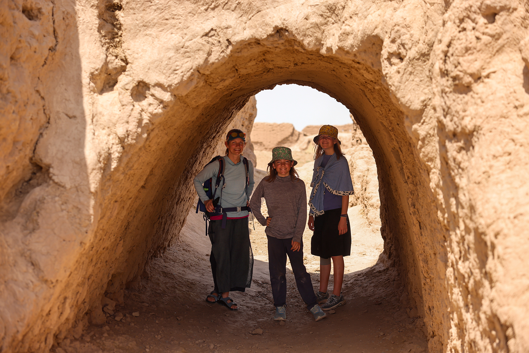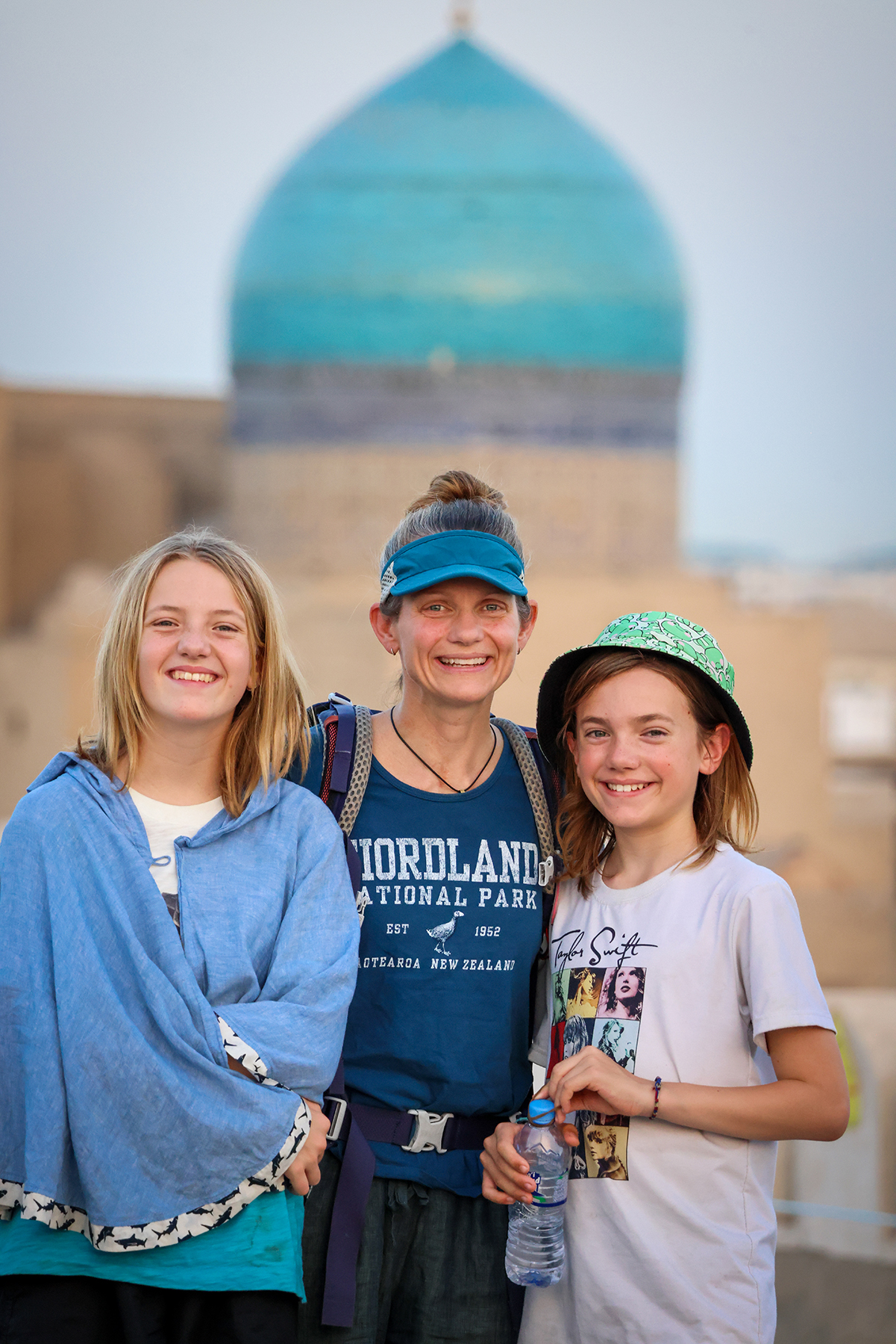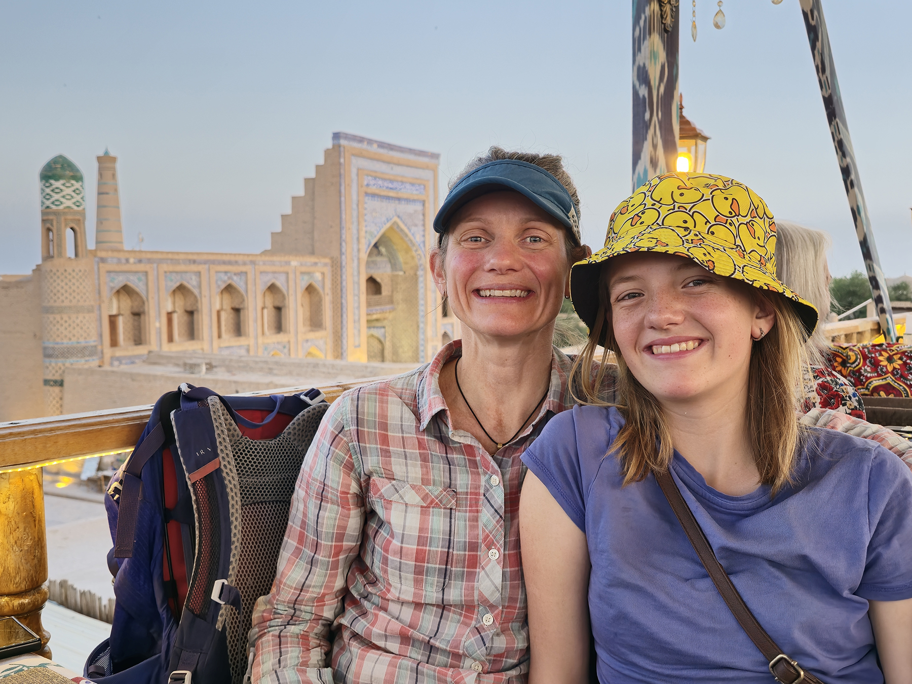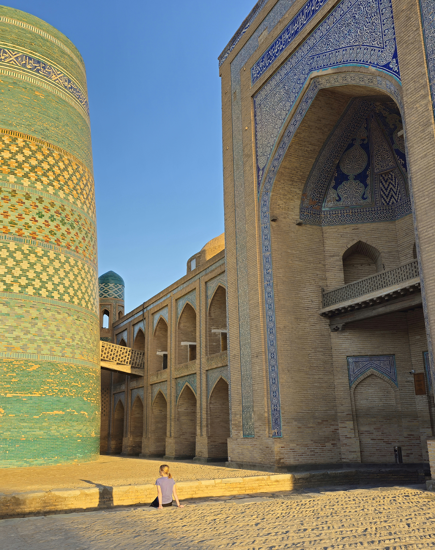 Our family loved exploring the car-free center of Itchan Kala in Khiva, especially during the late afternoon and evenings as the light (and temperature) faded. Some of my favorite moments were spent at our favorite rooftop restaurant, eating plov (a rice pilaf dish) and shashlik (kebabs) as we looked out across the square towards the madrasahs, the enormous unfinished Kaltaminor minaret, and Konya Ark. We concluded our time in Khviva with a final climb to the top of the Islam Khoja Minaret for a sweeping view out over the ancient city.