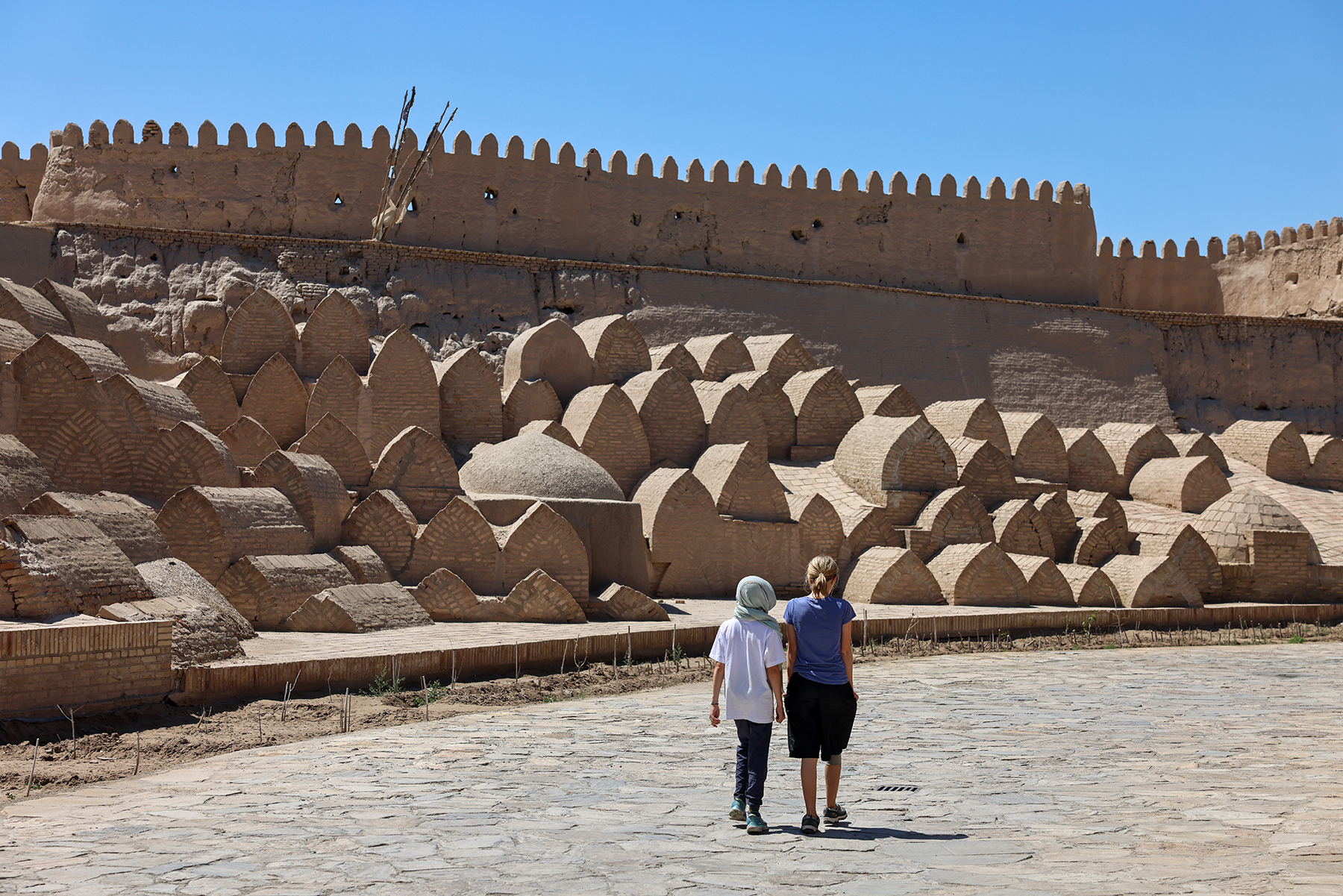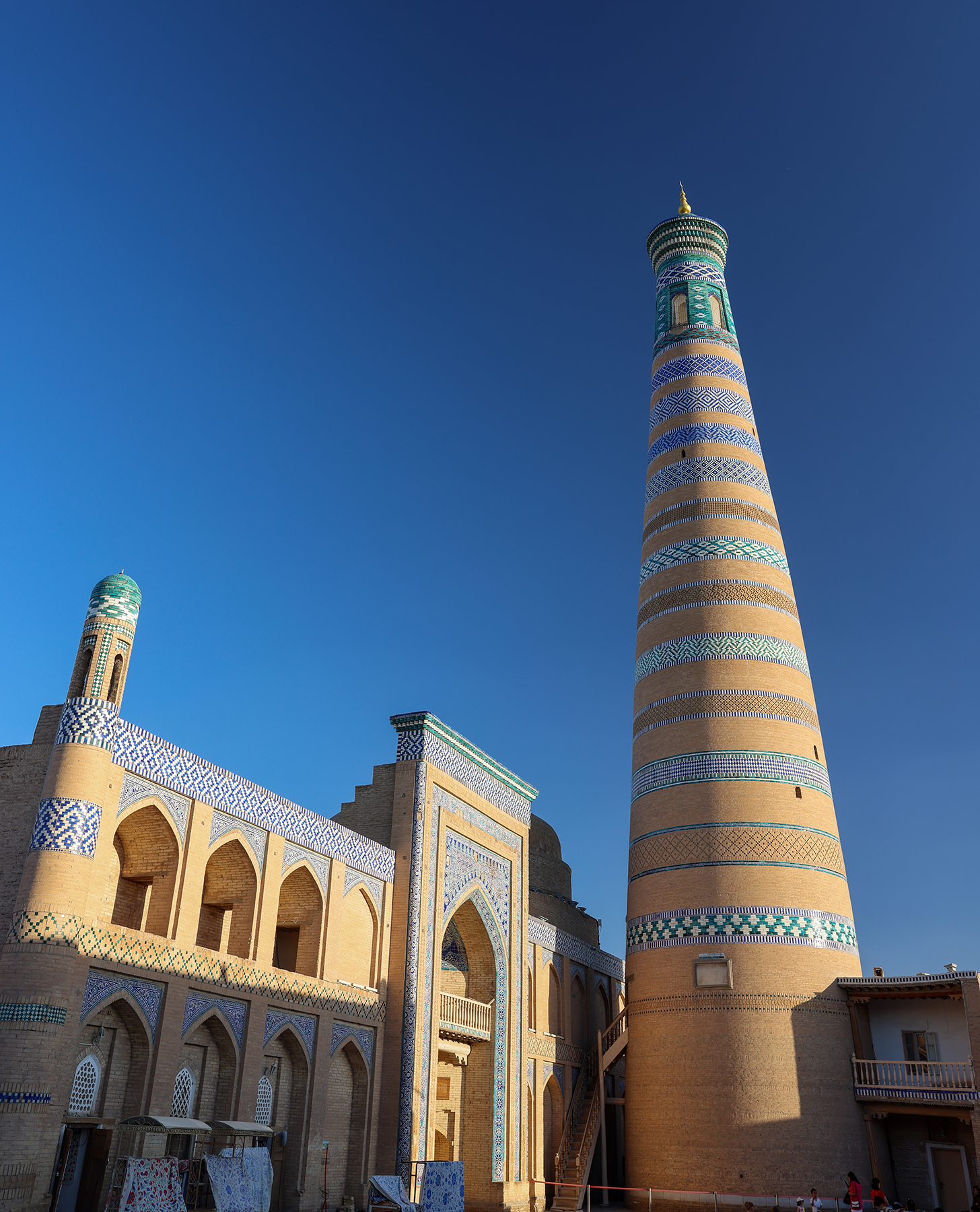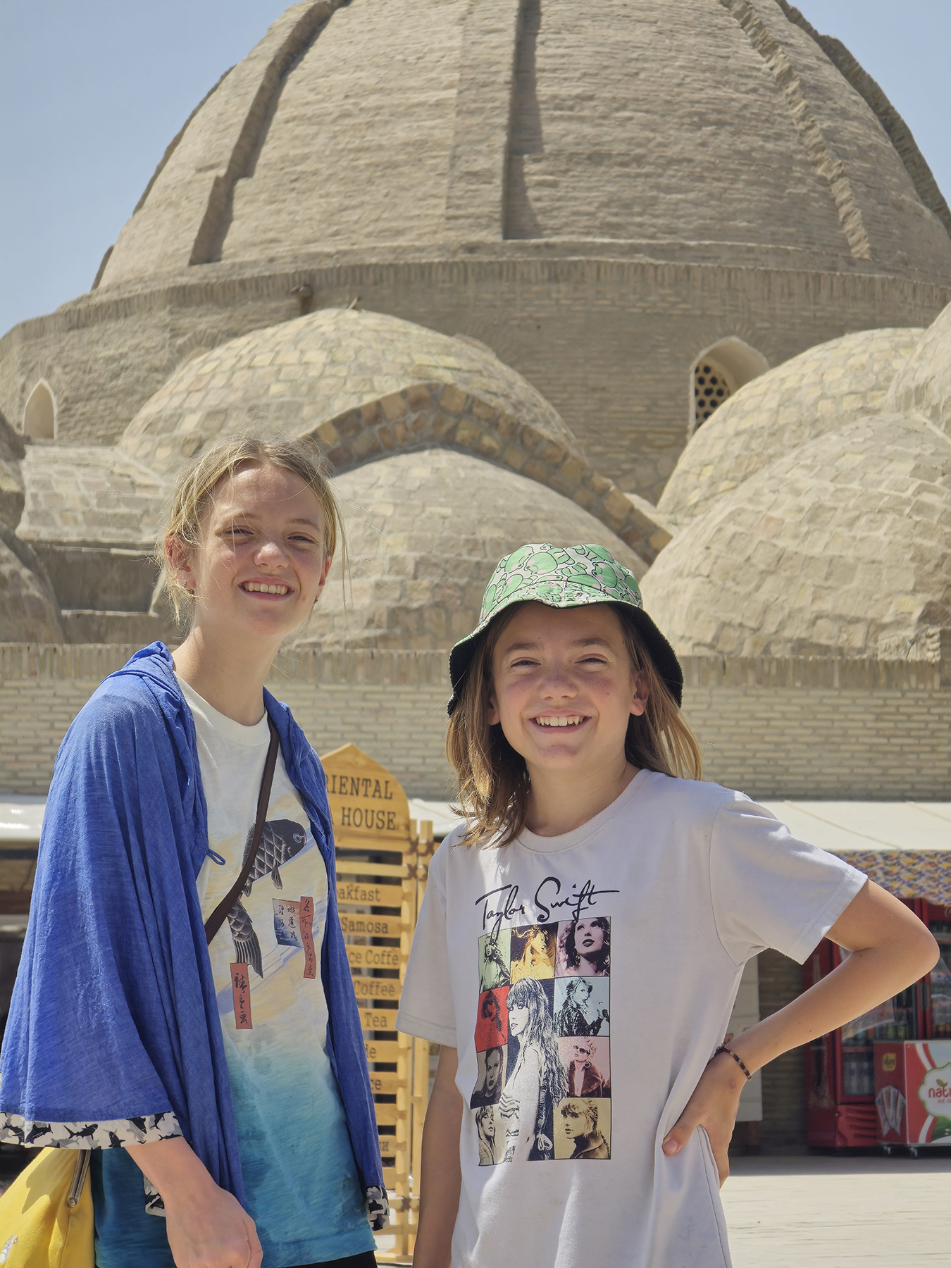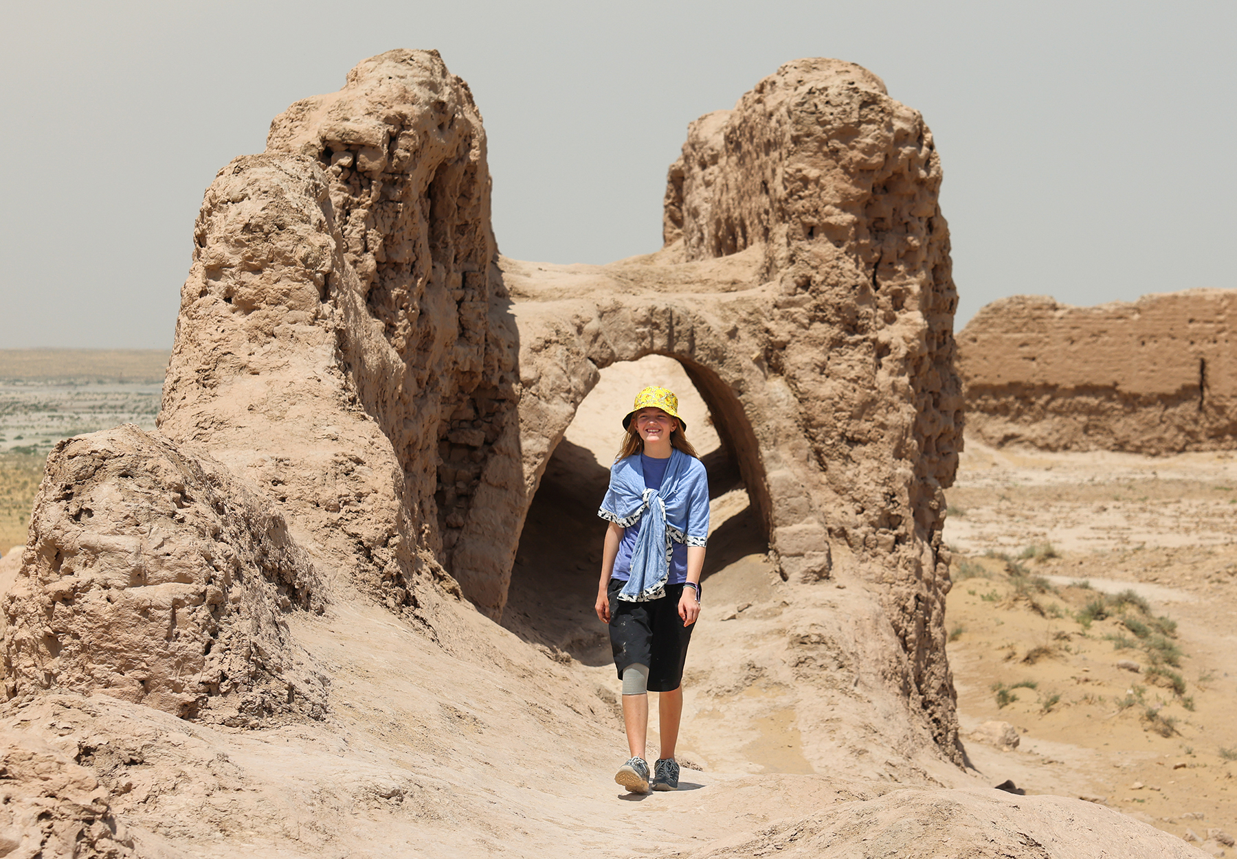 Our family loved exploring the car-free center of Itchan Kala in Khiva, especially during the late afternoon and evenings as the light (and temperature) faded. Some of my favorite moments were spent at our favorite rooftop restaurant, eating plov (a rice pilaf dish) and shashlik (kebabs) as we looked out across the square towards the madrasahs, the enormous unfinished Kaltaminor minaret, and Konya Ark. We concluded our time in Khviva with a final climb to the top of the Islam Khoja Minaret for a sweeping view out over the ancient city.
