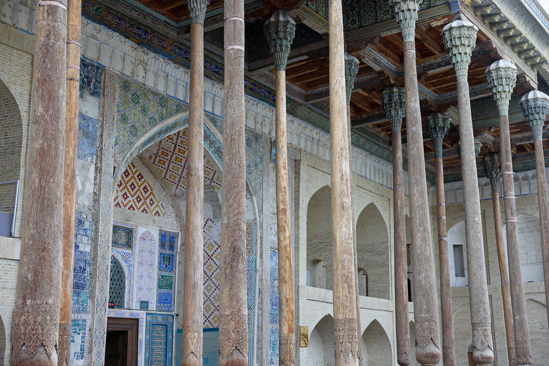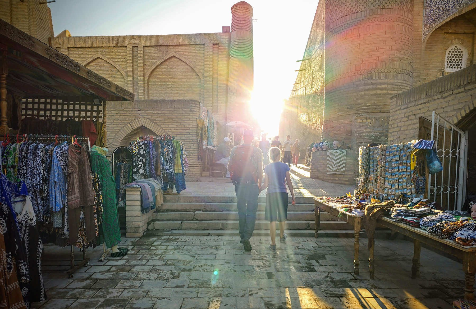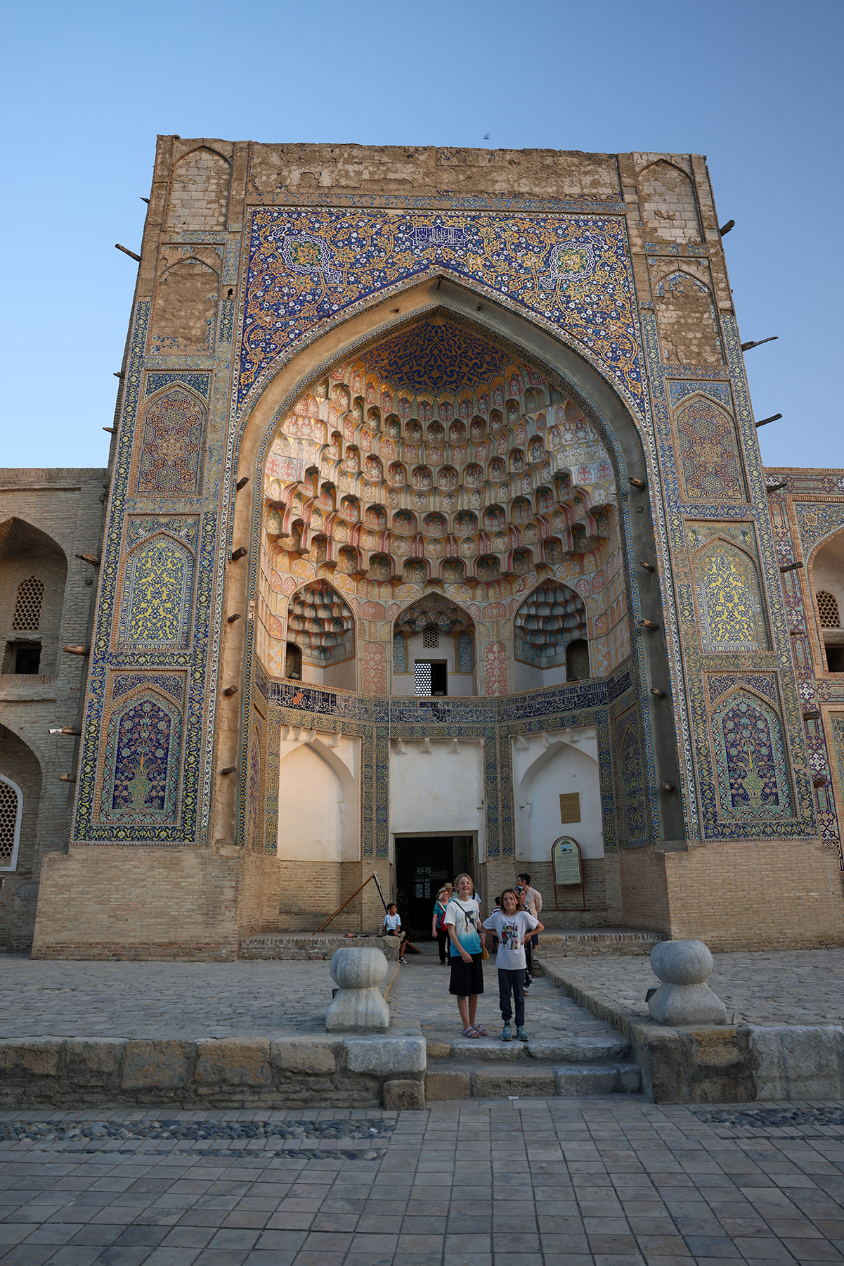 Our second major stop, the city of Bukhara, featured still more spectacular architectural history. The tiled blue domes, minarets, and Ark Citadel were a joy to explore despite the still sweltering heat. It was also fun to wander about the shops beneath the domes of the bazaar, with vendors selling textiles (much to Sonya’s delight), Soviet-era antiques, and beautiful instruments in a setting that looked like a double for a set from a Star Wars movie. I particularly enjoyed our evening walking around the Bolo Hovuz mosque, with its intricate tiled ceilings and carved wooden pillars, as well as the time spent atop the Ark Citadel overlooking the city.