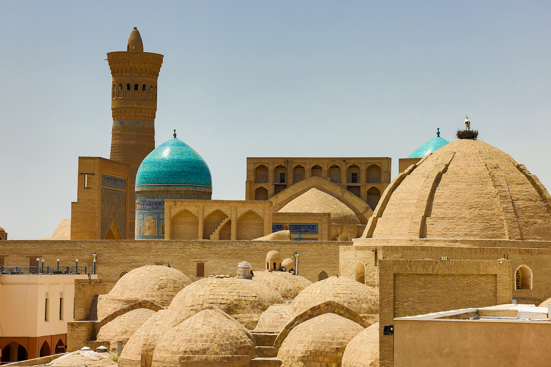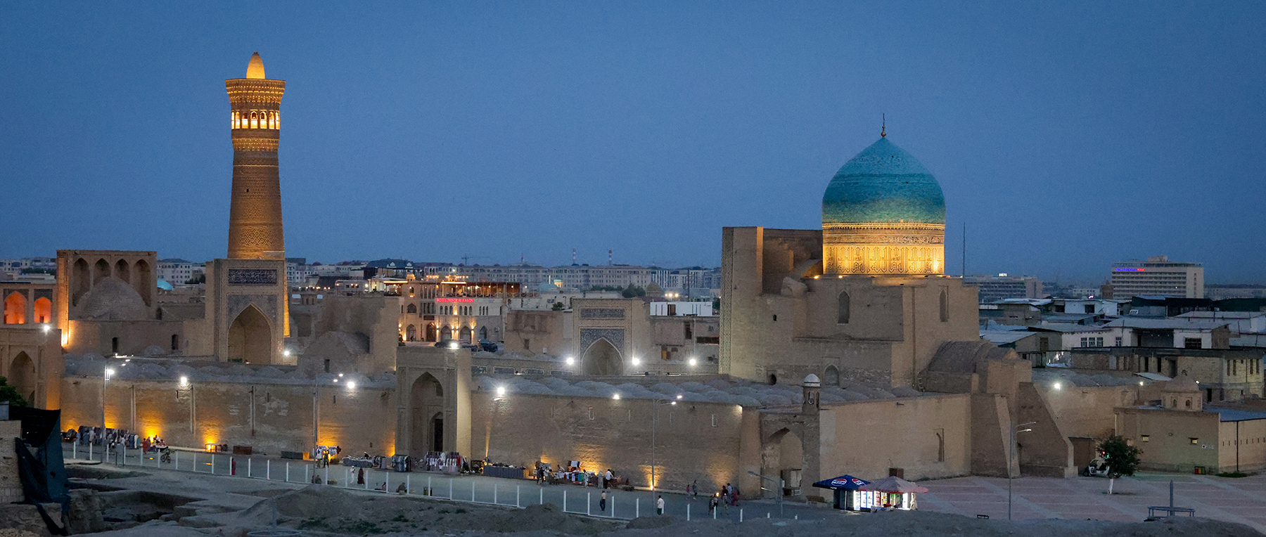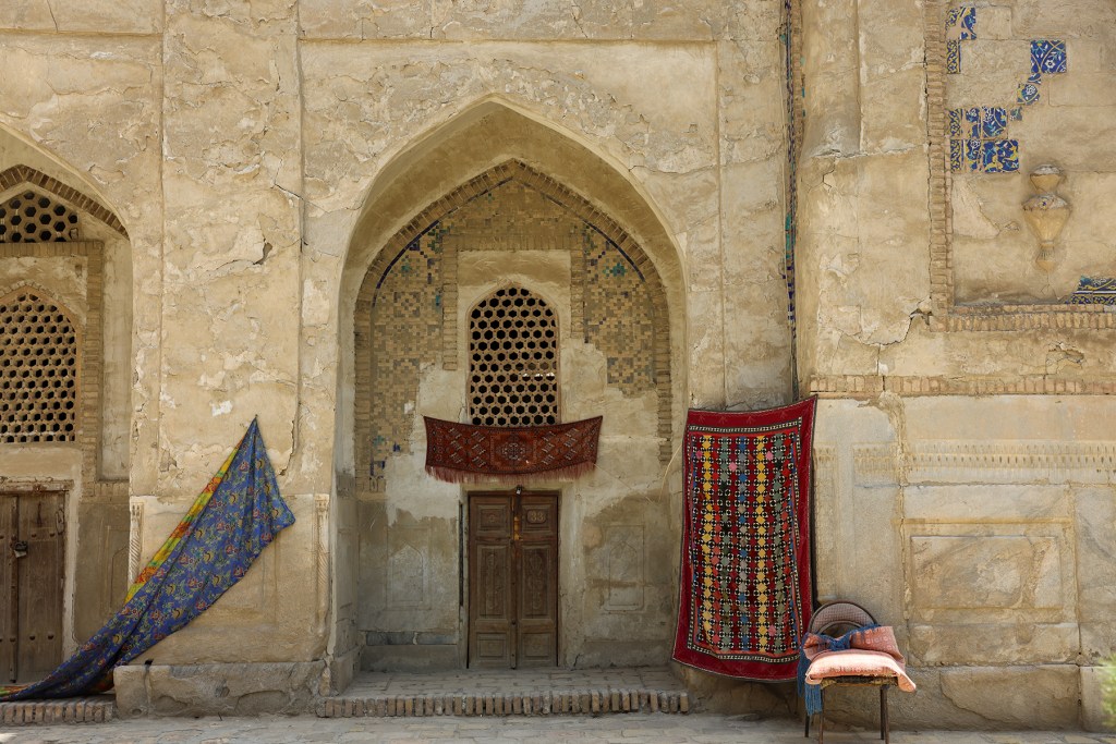 Our second major stop, the city of Bukhara, featured still more spectacular architectural history. The tiled blue domes, minarets, and Ark Citadel were a joy to explore despite the still sweltering heat. It was also fun to wander about the shops beneath the domes of the bazaar, with vendors selling textiles (much to Sonya’s delight), Soviet-era antiques, and beautiful instruments in a setting that looked like a double for a set from a Star Wars movie. I particularly enjoyed our evening walking around the Bolo Hovuz mosque, with its intricate tiled ceilings and carved wooden pillars, as well as the time spent atop the Ark Citadel overlooking the city.