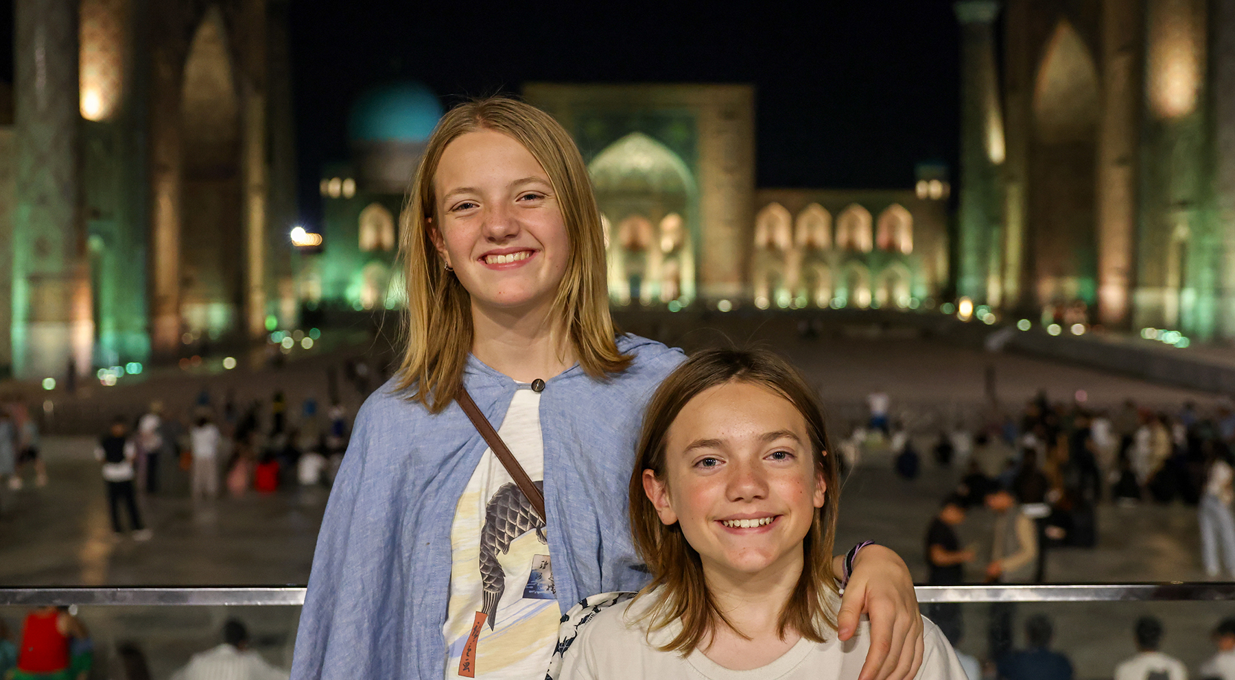 At the heart of Samarkand lies the architectural crown jewel of Central Asia: the breathtaking Registan Square. Three immense and ancient madrasas – centers of learning in science, mathematics, literature, and religion – flank its sides. In the evenings, the square comes alive with tourists and locals eating dinner, meeting friends, and enjoying the cool night air after the oppressive midday heat. One of our favorite family memories from Uzbekistan will be the four beautiful sunsets we witnessed in this uniquely wonderful place.