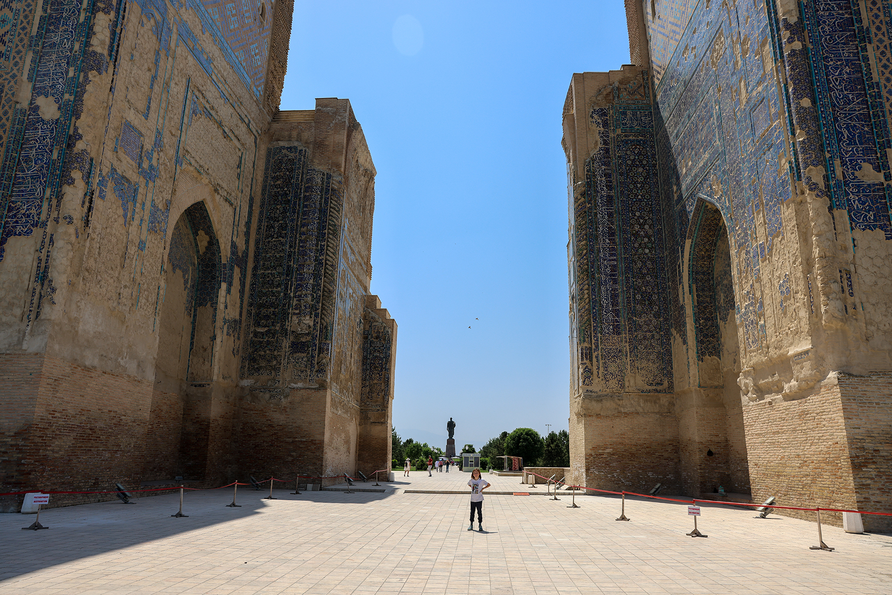 During our time in Samarkand, we also took a day trip to visit Amir Temur’s birthplace in the town of Shahrisabz (just north of the border with Afghanistan). Temur’s palace was built on this site during his reign, and while the palace has not been fully restored, portions of the massive entry gate still remain, and an absolutely colossal statue of Amir Temur has been erected on the grounds where his mighty palace once stood. The scale of it all is… a lot to take in.