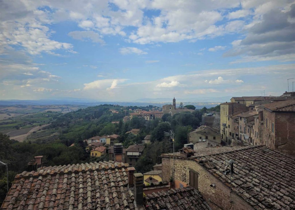 We took a train with our grandparents and halfway through we switched to a bus in Chiusa and the bus stopped in a small town in Tuscany called Montepulciano (Monto-pulch-ano) . We went from there and took a taxi to our apartment. This apartment has a stunning view.