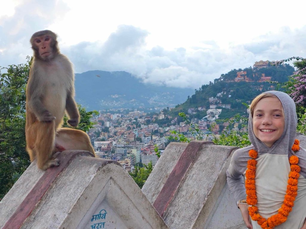 After talking with our guide we took a walk to get some of the stuff of our lists. We then stumbled into a cute store that sold shirts. I got an amazing I Heart Nepal shirt. Shopping in Nepal is very cheap and they expect you to negotiate. We then walked to the monkey temple hence the name a temple that has monkeys. This temple was stunning it was decorated with prayer flags and has a view of all of Katmandú. From the top Katmandú looks very calm but inside it is very chaotic I almost got hit by a litaral bus no I am not joking this bus was not stopping it was going 30 miles an hour and I needed to start running. The temple that there were two rival monkey gangs. All of the sudden a monkey would scream and ½ off the monkeys would chase after it making such a ruckus in the temple.